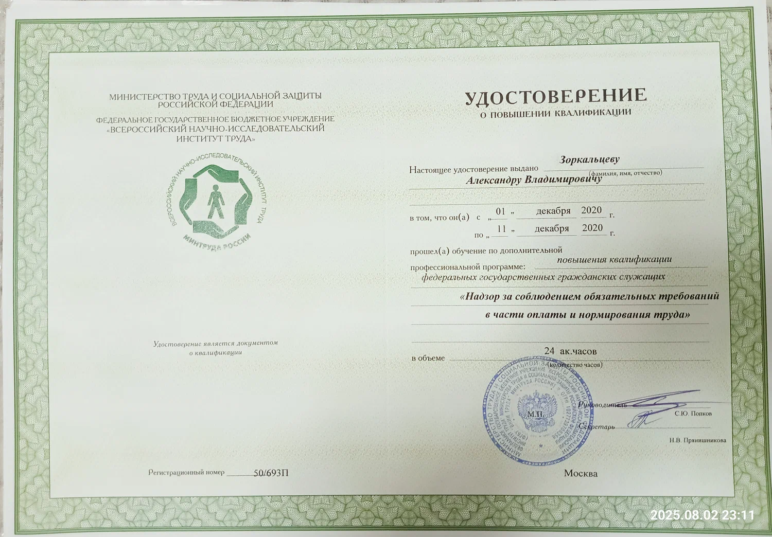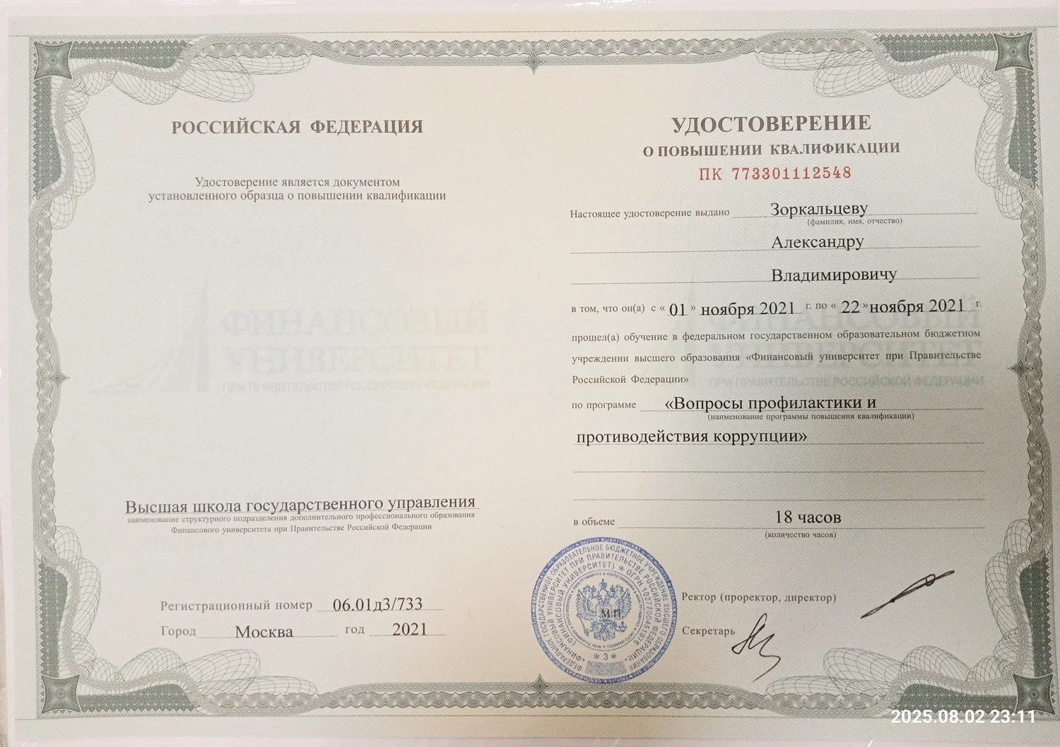 В 2025г. победитель ХX Всероссийского профессионального конкурса «Правовая Россия» (1 место) в номинации «Гражданский и арбитражный процесс».