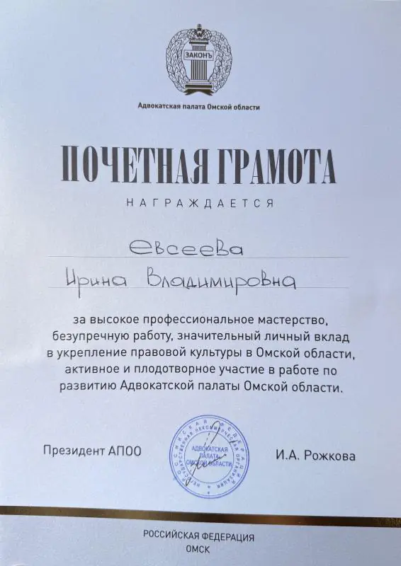 – Награждена почетной грамотой Адвокатской палаты Омской области