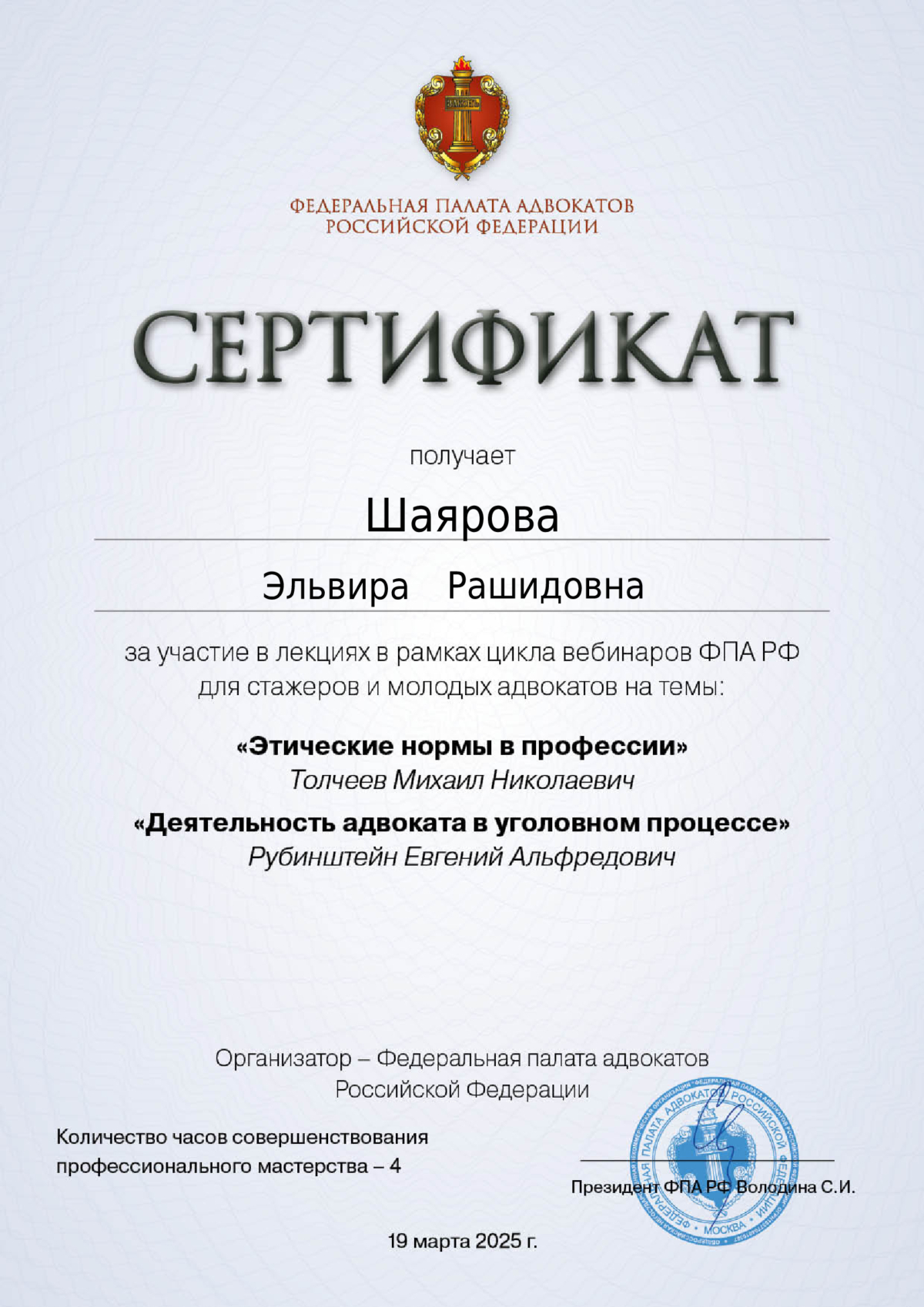 В 2020 году прошел профессиональную переподготовку в сфере арбитражного управления, что позволило расширить сферу деятельности и профессионально сопровождать дела о банкротстве.