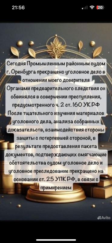 Адвокат с опытом работы в юриспруденции более 20 лет, член коллегии "Гильдия адвокатов Оренбургской области", предлагает следующие юридические услуги: - Защита подозреваемых и обвиняемых на всех этапах предварительного и судебного следствия, включая участие при предъявлении обвинения, допросах, задержаниях, обысках и других следственных действиях. - Разработка стратегии защиты, подача ходатайств и жалоб, сбор доказательств, ознакомление с материалами дела. - Защита по делам о преступлениях против собственности, включая кражу, грабеж, вымогательство, мошенничество, разбой, присвоение и растрату. - Защита по делам о незаконном обороте наркотиков, включая хранение, приобретение, изготовление и сбыт. - Защита по делам против жизни и здоровья, включая убийство, причинение вреда здоровью и угрозу убийством. - Помощь потерпевшим в привлечении виновных к уголовной ответственности и взыскании ущерба. - Защита свидетелей по уголовным делам. - Работа по замене наказания и оспариванию решений должностных лиц. - Составление ходатайств и жалоб. - Помощь по гражданским делам. Как происходит взаимодействие: 1. Первичная бесплатная консультация по телефону или в мессенджере. 2. Анализ вашего вопроса и документов (при наличии). 3. Оценка перспектив дела. Если шансов нет, честно об этом сообщается. 4. Официальное заключение договора при личной встрече. 5. Сопровождение до достижения результата.