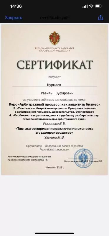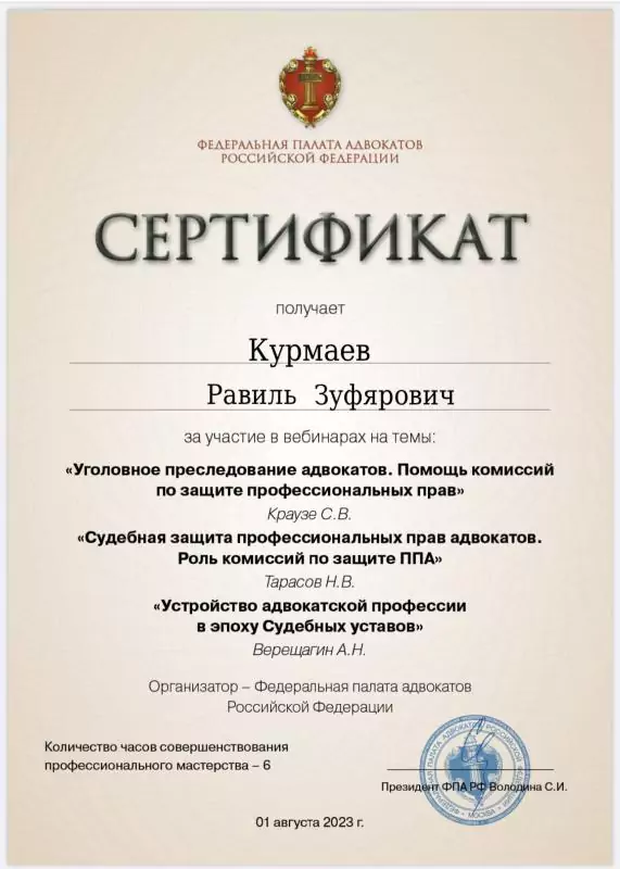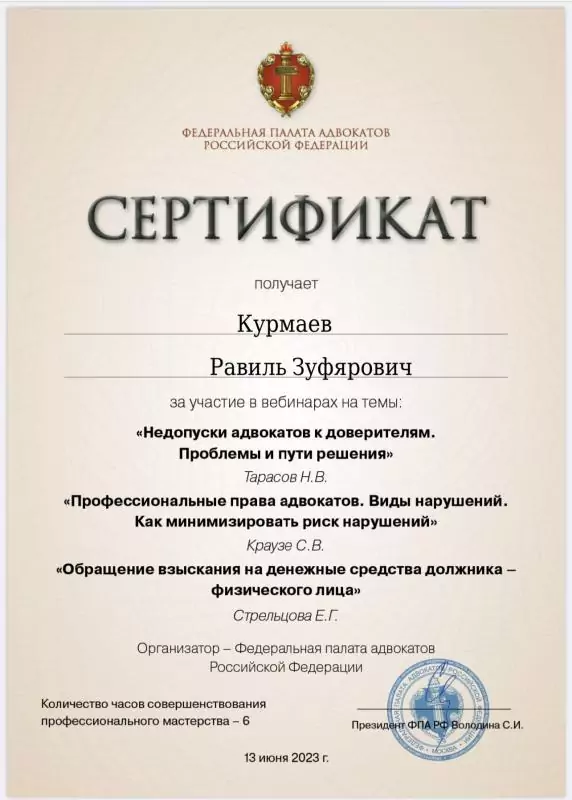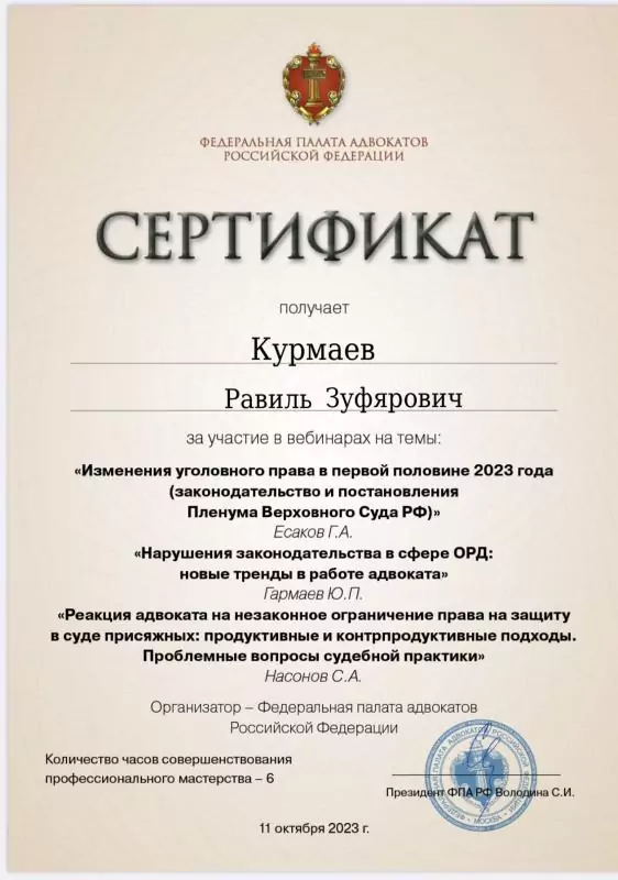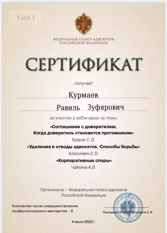 Список судебных дел в карточке адвоката может быть не полным и зависит от того, указан ли адвокат Курмаев Равиль Зуфярович в деле или нет