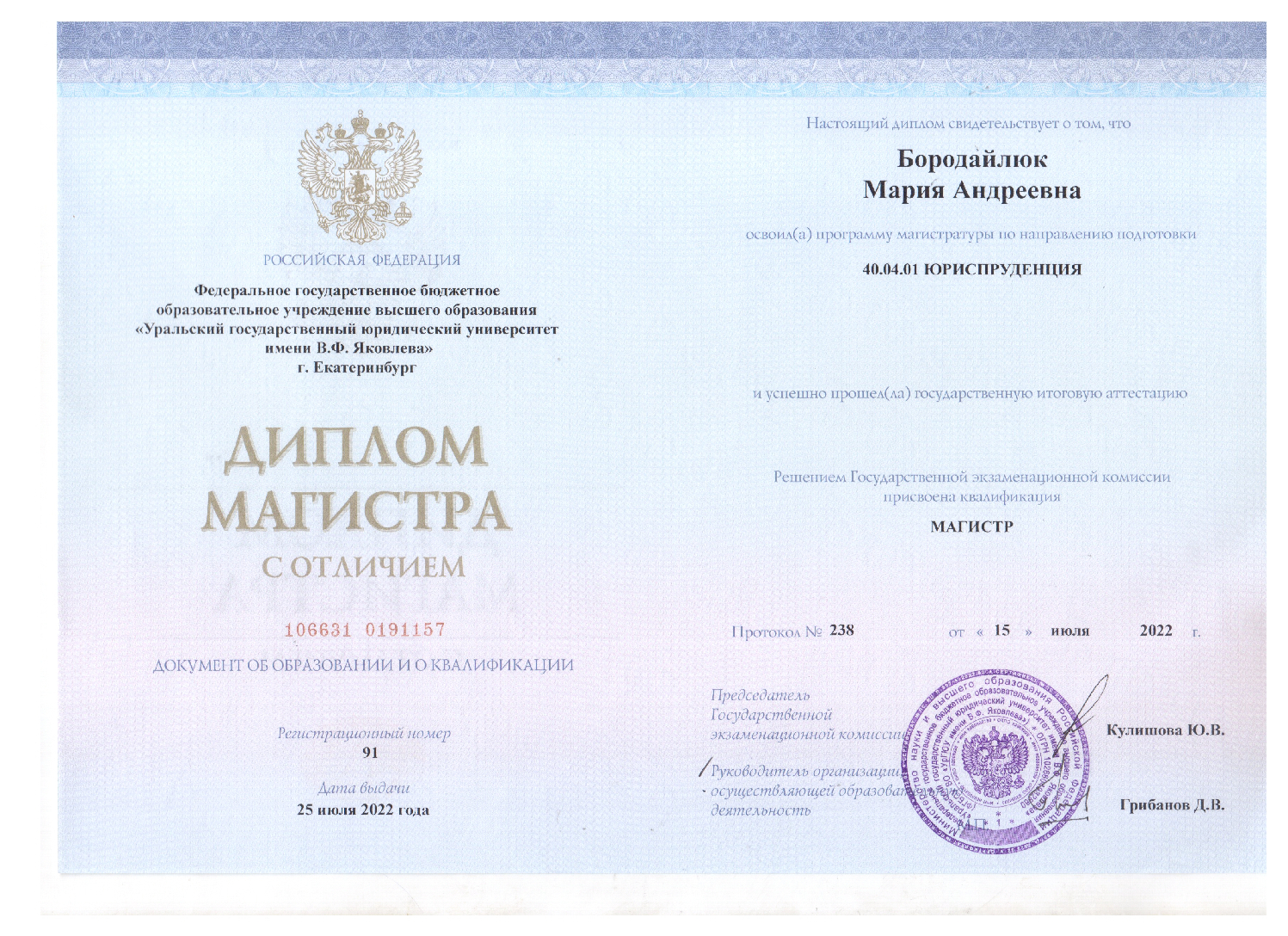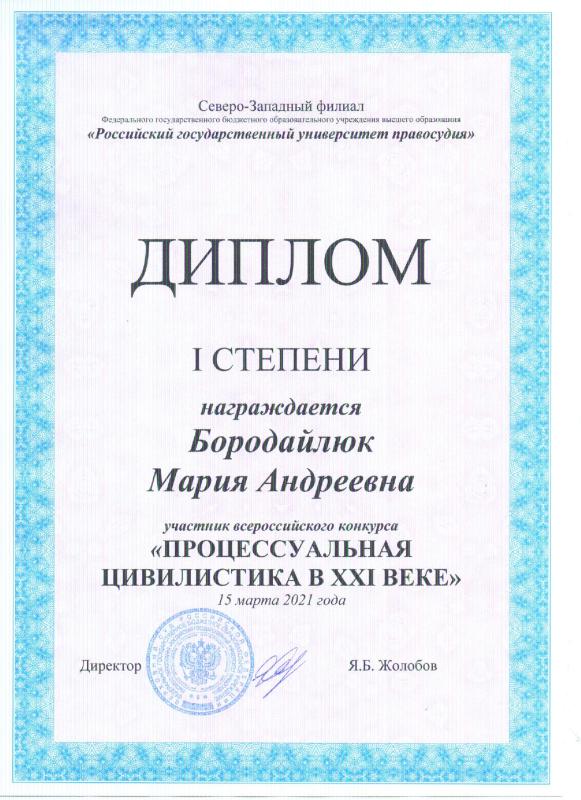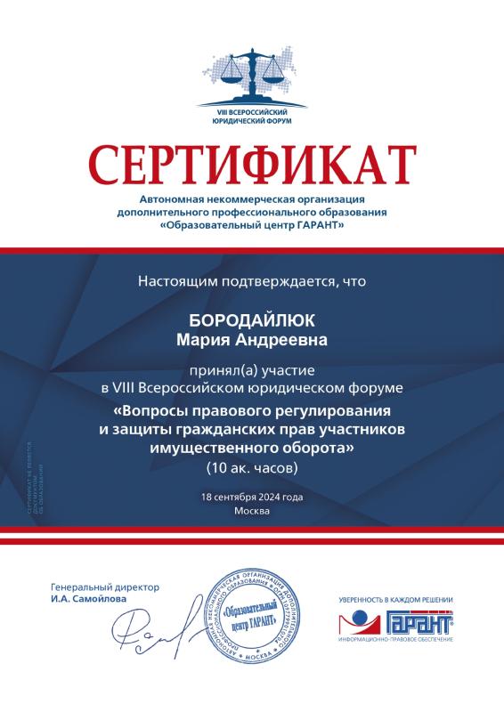 Меня зовут Бородайлюк Мария и я судебный юрист. В 2020 году я окончила бакалавриат, а в 2022 году с отличием окончила магистратуру Уральского государственного юридического университета им. В.Ф. Яковлева по направлению «Современный гражданский процесс и административное судопроизводство». С 2020 года я успешно работаю в сфере судебного представительства. Я могу предложить Вам свою помощь по множеству категорий дел, рассматриваемых арбитражными судами, в числе которых: - банкротство; - имущественные споры; - корпоративные споры; - споры в сфере интеллектуальной собственности; - административные споры (гл. 25 АПК РФ). Нахожусь я в городе Екатеринбурге, но веду судебные дела во многих городах России! Если Вам нужно выиграть суд - я буду рада помочь!