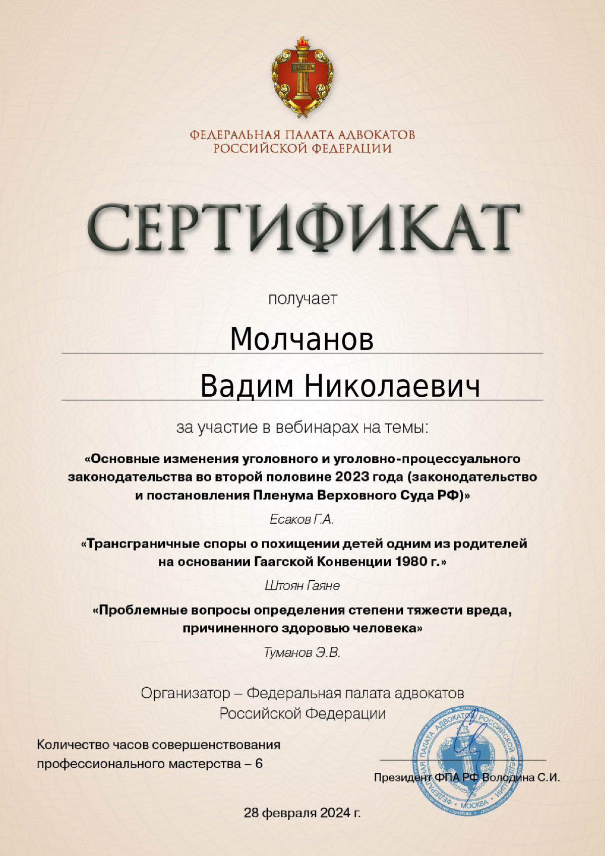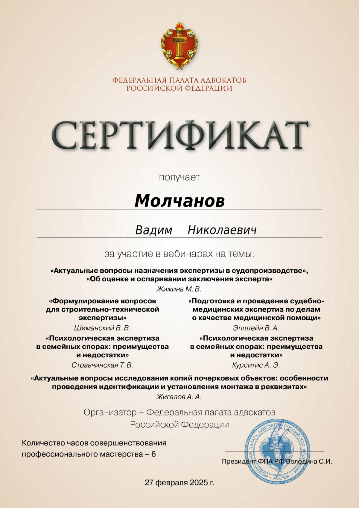 Вадим Николаевич Молчанов, адвокат с 2015 года, имею два высших образования — юридическое и техническое, что позволяет мне разбираться в широком круге вопросов. Мой нестандартный и неординарный подход к решению даже самых сложных задач помогает добиваться положительных результатов для доверителей в казалось бы безнадежных вопросах. Основополагающий принцип моей работы: я не берусь за дела, в которых не вижу перспективы. Если я не смогу Вам помочь, я честно сообщаю Вам об этом, даже если бы вы хотели услышать от меня что то иное. Убежден, что у адвоката есть только одна форма капитала-его репутация.