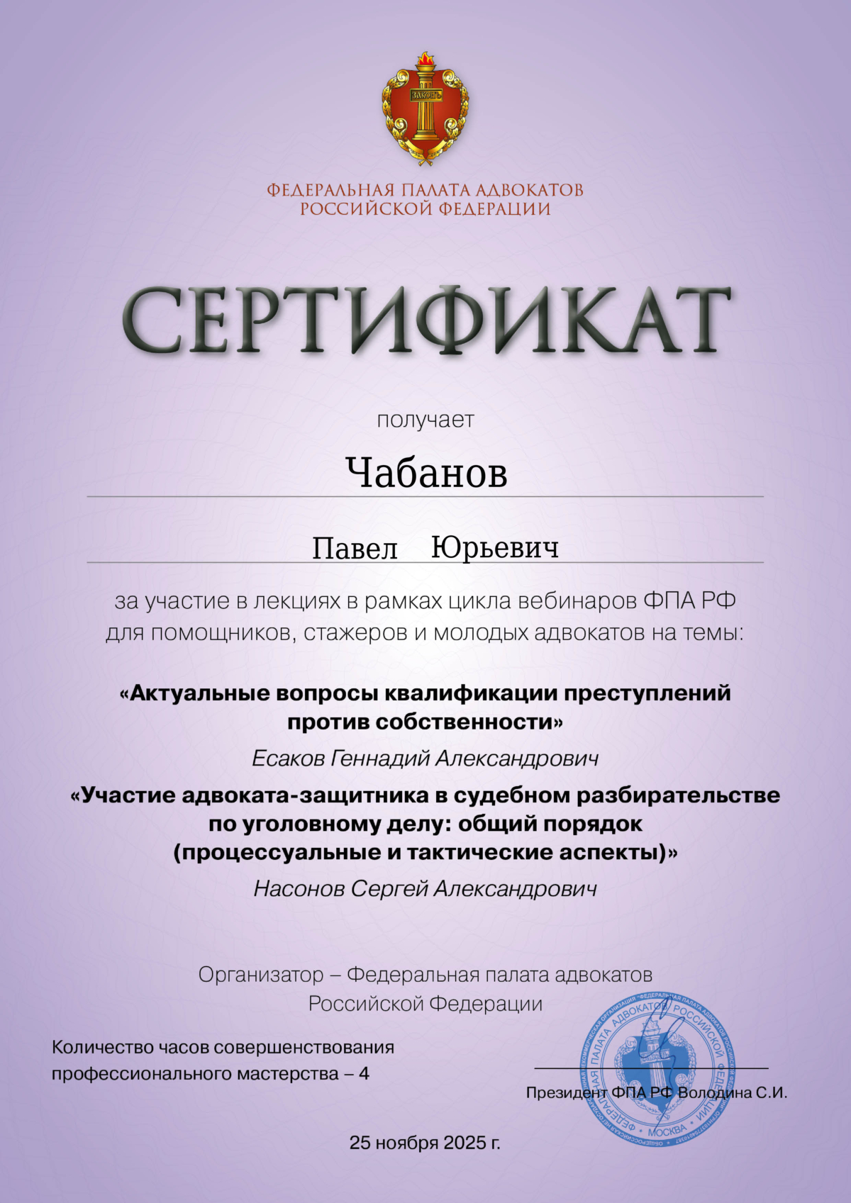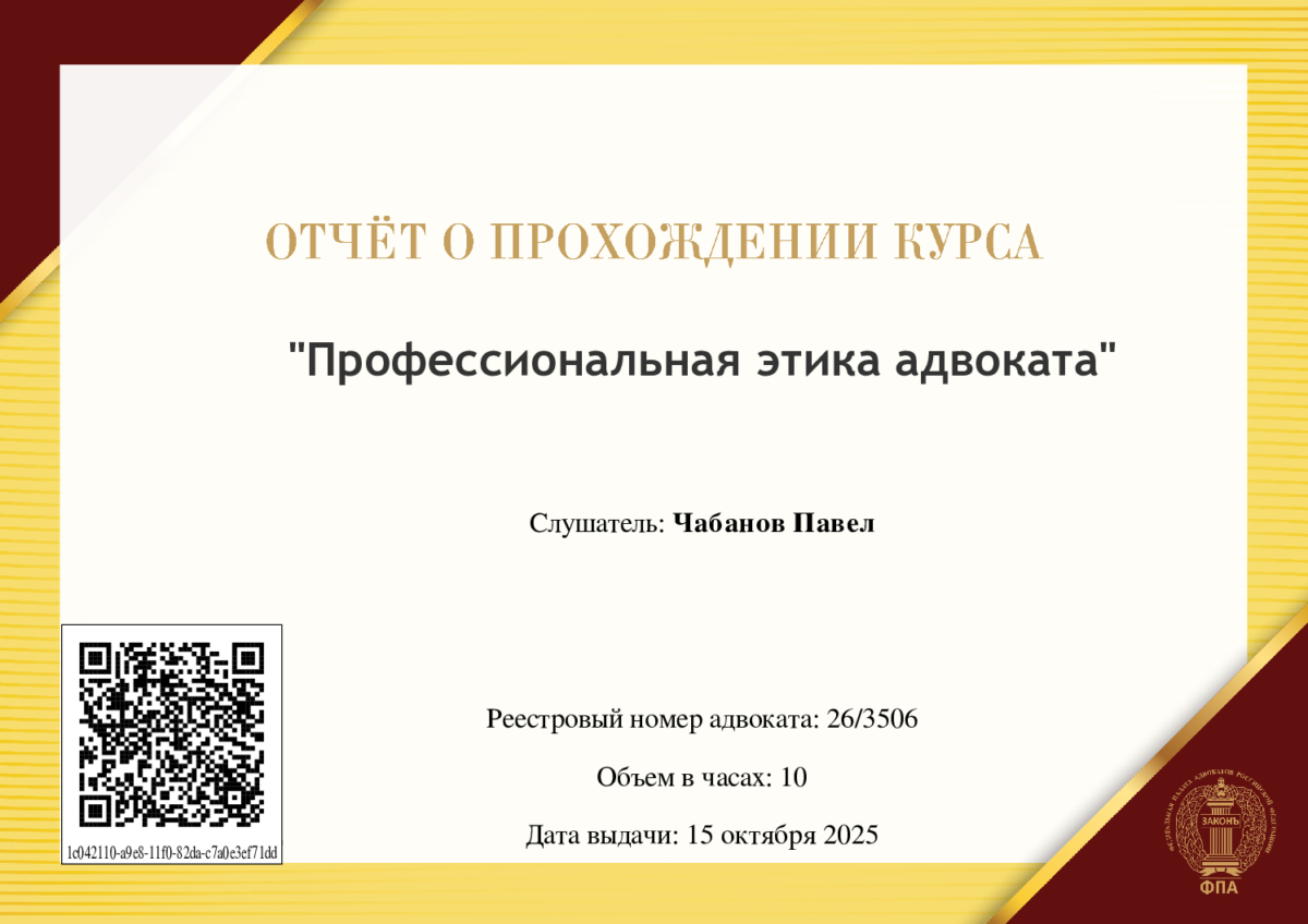 Адвокатскую деятельность осуществляю с 13.12.2011, регулярно повышаю квалификацию.