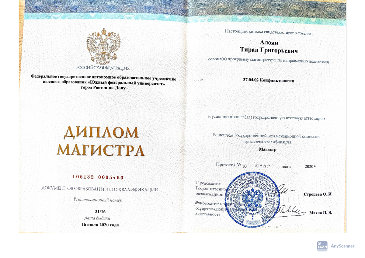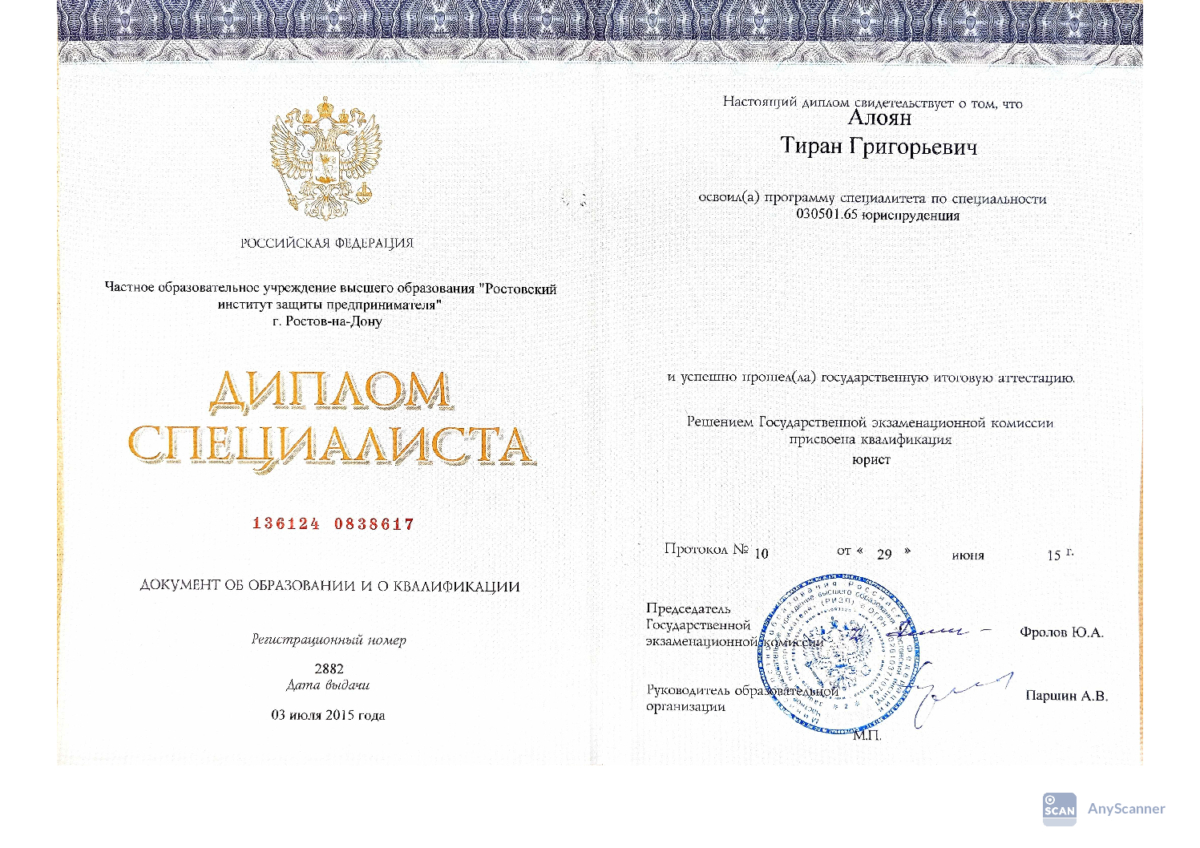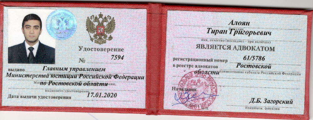 Тиран Григорьевич Алоян. Квалифицированный Адвокат и член Адвокатской палаты Ростовской области. До 2020 года я был практикующим юристом. 17 января 2020 года после успешной сдачи квалификационного экзамена мне был присвоен статус адвоката. Стаж моей практики составляет 9 лет. Все эти годы, как и сейчас, в своей работе я руководствуюсь исключительно добросовестностью. Это заставляет меня быть корректным с моими доверителями, и подходить к каждому делу с особым вниманием. В моем портфеле уже более 100 кейсов по уголовным делам. За свою работу я отвечаю лично. Моя профессиональная репутация дороже мне любых гонораров.