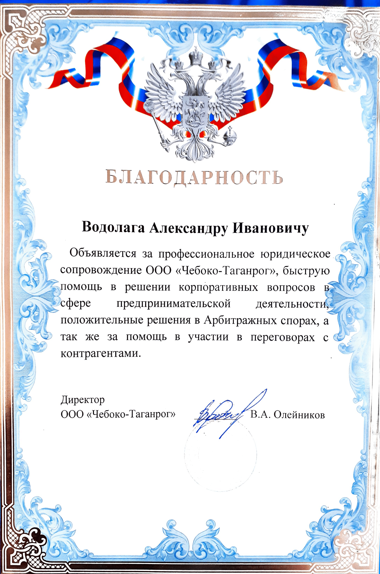 Список судебных дел в карточке юриста может быть не полным и зависит от того, указан ли юрист Водолага Александр Иванович в деле или нет