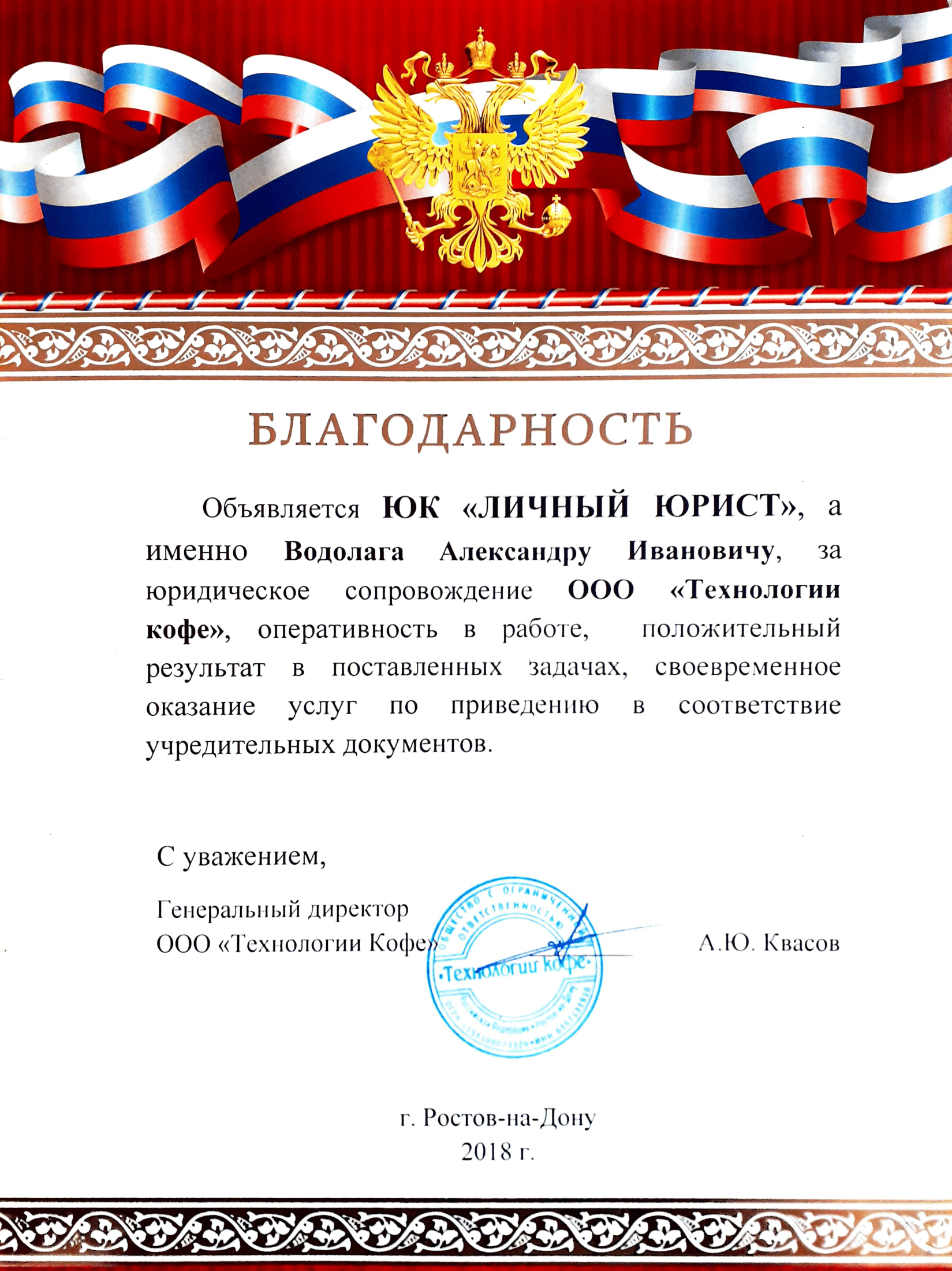 ⚖️ Здравствуйте, меня зовут Александр Водолага. Я — дипломированный юрист-практик, основатель компании «Личный Юрист». Беспрерывная юридическая практика с 2012 года. Оказываю юридические услуги по Ростову-на-Дону и Ростовской области. ⚡ Если вы хотите раз и навсегда решить вашу юридическую проблему, мы поможем это сделать ✔️ Представим ваши интересы в суде ✔️ Составлю исковое заявление ✔️ Работаю как с юридическими, так и с физическими лицами. ✔️ Есть опыт работы с крупными гос.компаниями ПРЕДОСТАВЛЯЮ ГАРАНТИЮ КАЧЕСТВЕННЫХ ЮРИДИЧЕСКИХ УСЛУГ! ✅ Честность профессиональный подход – мой основной принцип; ✅ Оплата происходит по принципу «работа + результат»; ✅ Индивидуальный подход к каждой проблеме; ✅ Анализ документов – бесплатно. Консультации БЕСПЛАТНО, звоните, чтобы я вам помог!