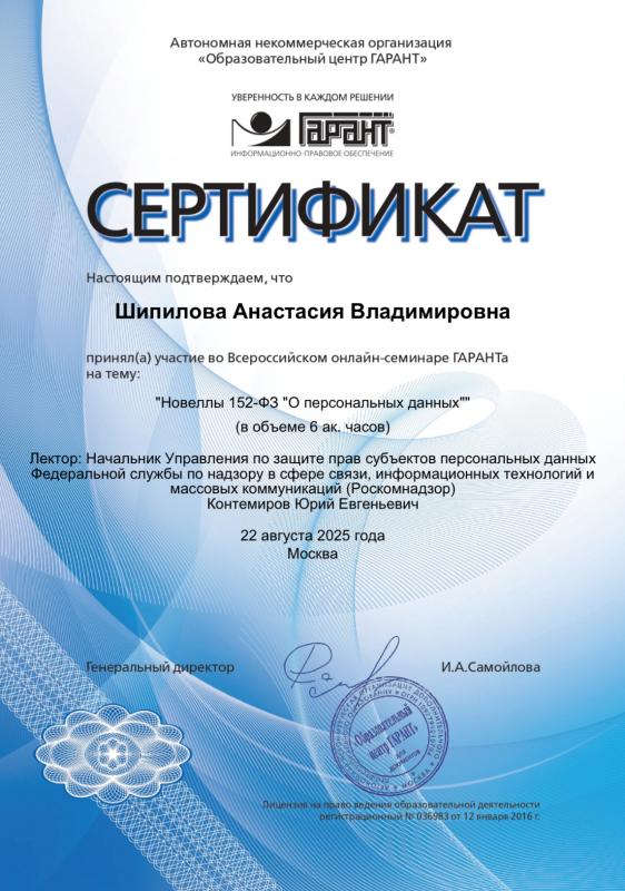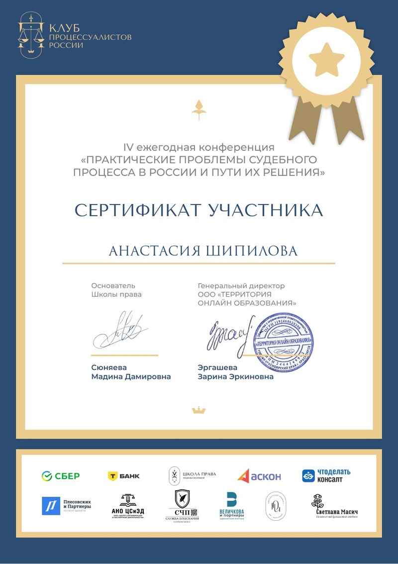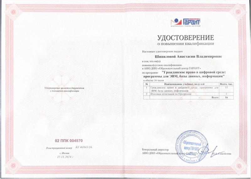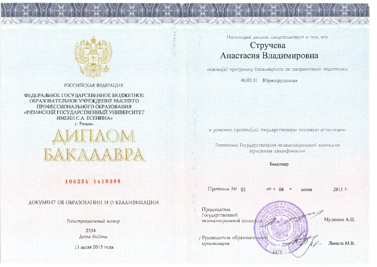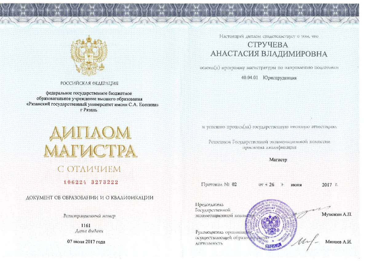 Практикующий юрист по гражданским, административным и арбитражным спорам. Имею три высших образования, из них высшее юридическое образование, квалификация (степень) "Магистр". Также провожу судебные экспертизы, имею квалификацию "Судебный эксперт". Член "Ассоциации юристов России". Стаж работы по специальности с 2007 года. Стаж судебно-экспертной работы с 2012 года. Награждена Знаком Губернатора Рязанской области "В память 80-летия Рязанской области" (2017 г.) за заслуги при защите прав граждан и укреплении законности. Благодарность Межмуниципального отдела Министерства внутренних дел Российской Федерации "Скопинский" за организацию и производство судебных товароведческих экспертиз. Индивидуальный подход к каждому делу. Осуществляю качественную результативную защиту Ваших прав.