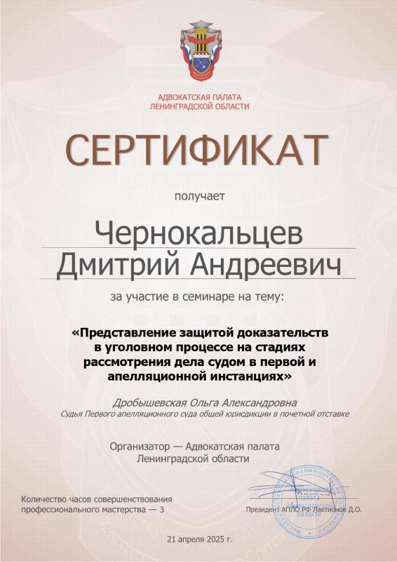 Юридический стаж с 1992 г. с момента поступления на службу в следственные органы при ГУВД СПб и ЛО. С 2002 г. работа адвокатом в СПб Объединённой коллегии адвокатов. С 2022 г. являюсь заместителем председателя Объединённой коллегии адвокатов Невская и заведующей консультацией Политехническая. Опыт ведения различных дел различной сложности и многообразности, начиная от уголовных дел и представительство в судах и общей юрисдикции и кассационных и Арбитражных судах. Опыт большой и соответственно практика.