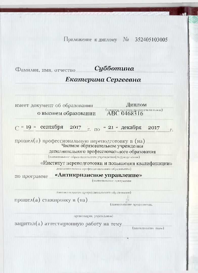 Постоянно совершенствую свои знания и навыки, являюсь аккредитованным налоговым консультантом, училась в ведущих ВУЗах страны (специалитет и аспирантура) в общей сложности 11 лет.