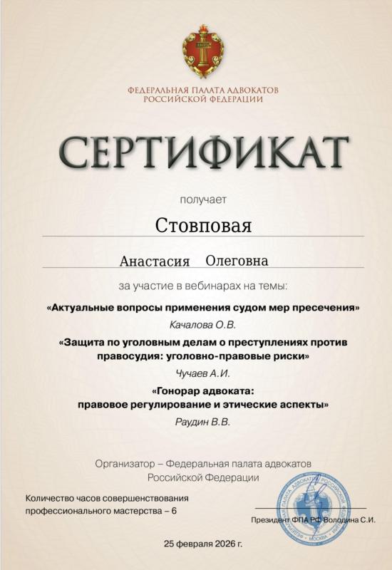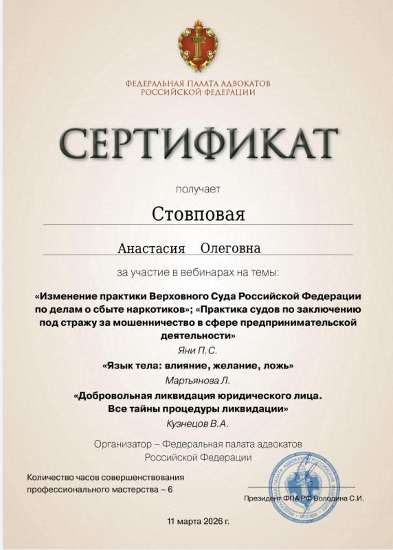 Являюсь адвокатом, состою в Адвокатской палате г. Санкт-Петербурга, реестровый № 78/8465. Моя специализация — уголовное право и процесс. Сопровождаю как подозреваемых, обвиняемых, подсудимых, так и потерпевших, свидетелей. Для каждого дела разрабатываю детальную стратегию защиты. Имею степень магистра по направлению «Юрист в сфере уголовного судопроизводства».
