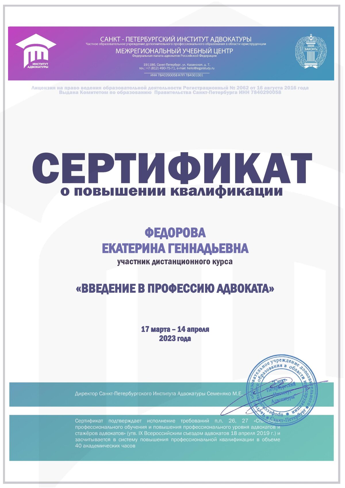 Адвокат Федорова Екатерина Геннадьевна Основная специализация: защита по уголовным делам и делам об административных правонарушениях ✅Работаю на основании соглашения об оказании юридической помощи. ✅Опыт работы более 8 лет, в том числе в правоохранительных органах ✅Полная оценка ситуации, делаю все возможное для успешного результата. ✅Обширная положительная практика по уголовным делам, в том числе о преступлениях в экономической сфере. Оказываю следующие услуги: 📌представление интересов в суде, государственных органах и иных организациях, 📌дача консультаций и разъяснений действующего законодательства, 📌составление документов юридического характера, в том числе претензий, исковый заявлений, ходатайств, жалоб, 📌защита по уголовным делам подозреваемых и обвиняемых на стадии предварительного следствия и в суде, 📌представление интересов потерпевших и свидетелей, участие в следственных действиях в ходе предварительного следствия, 📌защита по делам об административных правонарушениях.