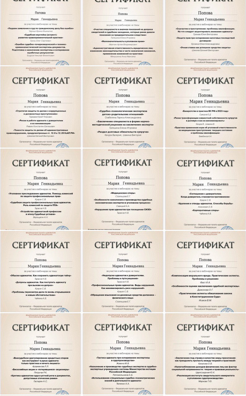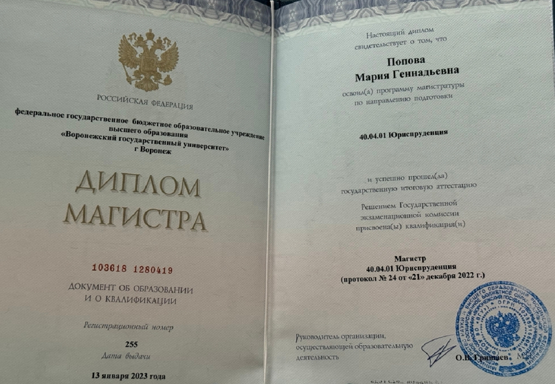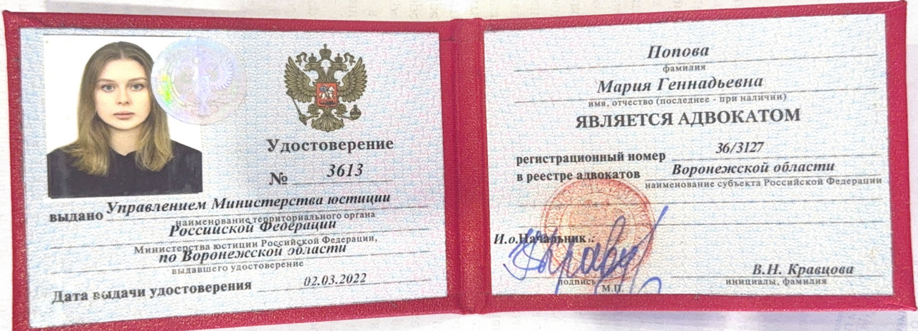 Адвокат Попова Мария Геннадьевна, реестровый номер 36/3127. Опыт в юриспруденции более 10 лет. Квалифицированная юридическая помощь для граждан.