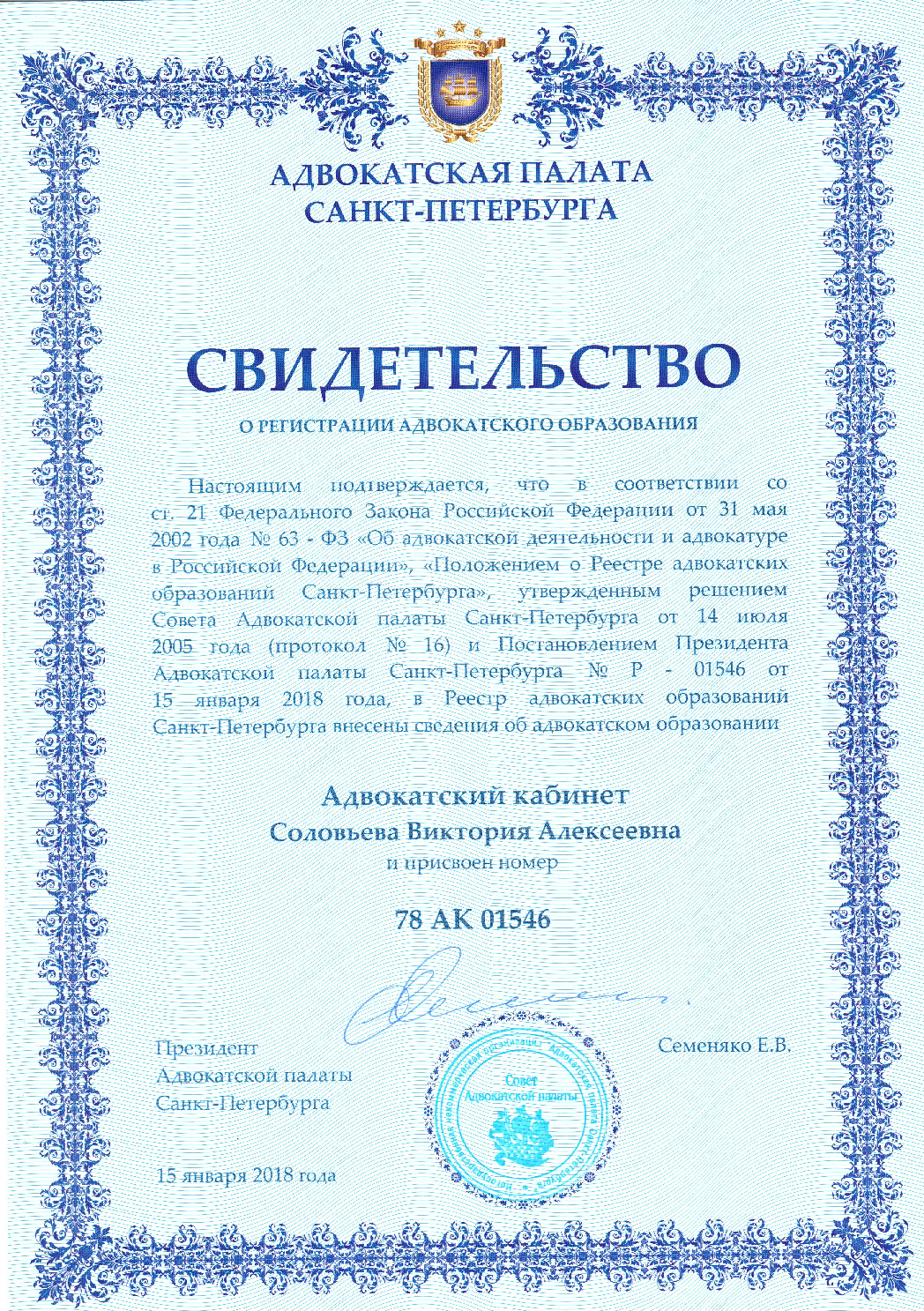 Повседневная жизнь каждого человека состоит из постоянного процесса поиска решений, как мелких житейских проблем, так и более серьезных жизненных cитуаций, от правильного разрешения которых зависит не только полноценная реализация своих прав, но порой и личная свобода. Накопленный опыт, позволяет мне успешно осуществлять защиту моих доверителей. Являясь специалистом в своем деле, я постараюсь оправдать Ваши надежды и доверие, оказав Вам квалифицированную юридическую помощь. Адвокатский кабинет Соловьева Виктория Алексеевна тел: +7 (981) 863 79 58 e-mail: advokat78ru@yandex.ru http://vk.com/id271029462 http://advokat78ru.wix.com/victoria