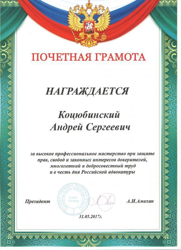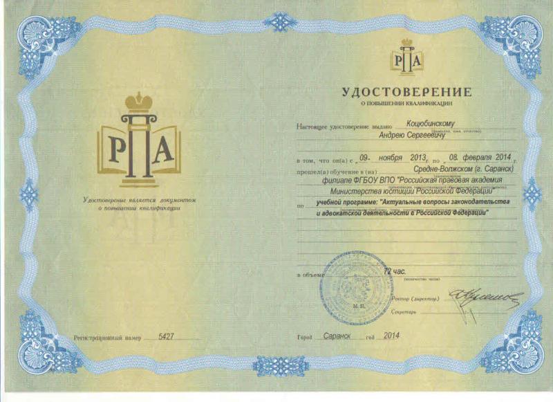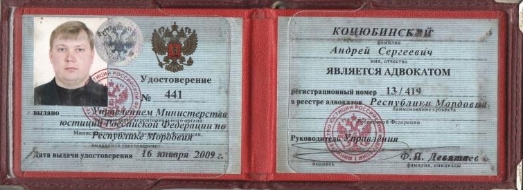 Адвокат Коцюбинский Андрей Сергеевич, член Адвокатской палаты Республики Мордовия, удостоверение №441, регистрационный номер в реестре адвокатов 13/419, юридический стаж с 2003 года. В 2003 году закончил юридический факультет МГУ им.Н.П.Огарева по специальности “Юриспруденция”, с 2003 г. по 2008 г. работал в органах следствия МВД РМ, с 2008 г. адвокат Адвокатской палаты Республики Мордовия. Специализируюсь на защите прав и законных интересов клиентов на всех стадиях уголовного процесса (доследственные проверки, дознание и предварительное следствие, судебное разбирательство), обжалование приговоров, определений, решений судов в апелляционной, кассационной, надзорной инстанциях, обжалование действий (бездействий) должностных лиц, помощь в реализации осужденным права на условно-досрочное освобождение (УДО), оказываю весь спектр юридических услуг в области уголовного права. Оказываю помощь по гражданским, семейным делам, арбитражному праву, защите прав предпринимателей. Знания, приобретенный опыт, повседневное изучение изменений законодательства позволяют оказывать моим доверителям квалифицированную юридическую помощь