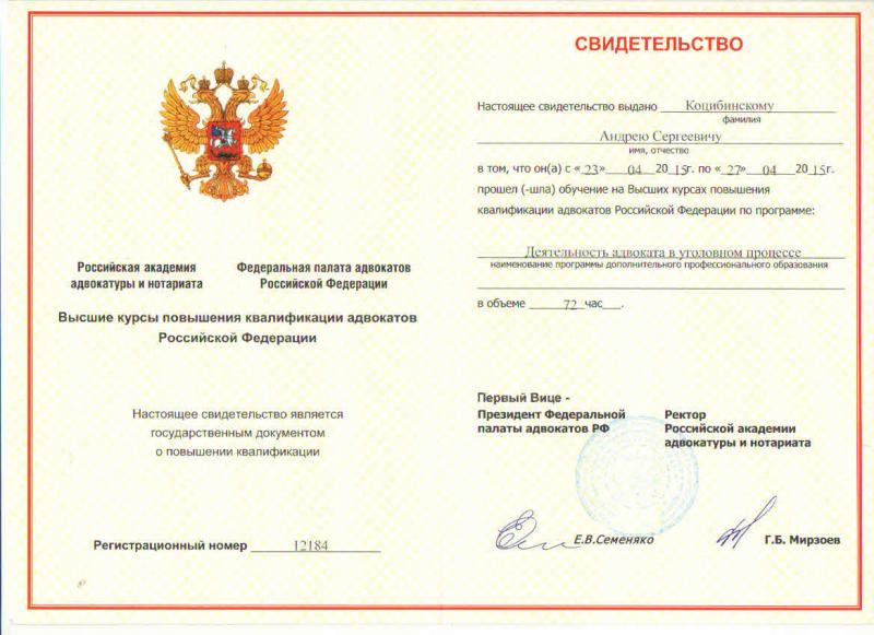 Высшие курсы повышения квалификации адвокатов РФ. "Деятельность адвоката в уголовном процессе." - Москва