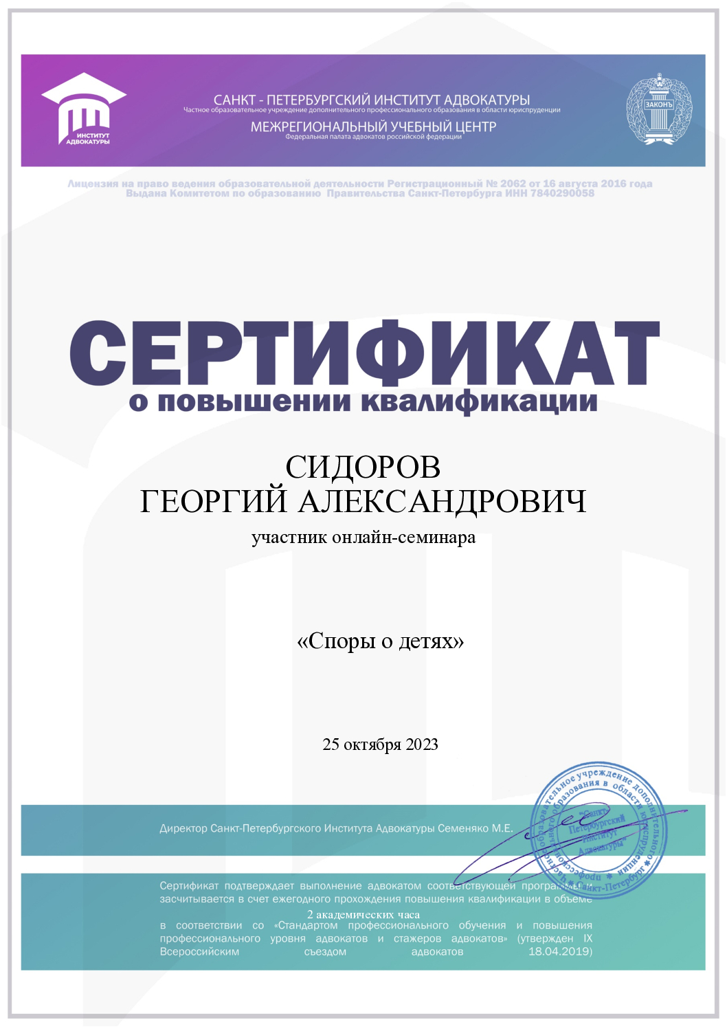 Адвокатскую деятельность совмещаю с преподавательской: с 2018 года являюсь старшим преподавателем Севастопольского филиала РЭУ им. Г.В. Плеханова.