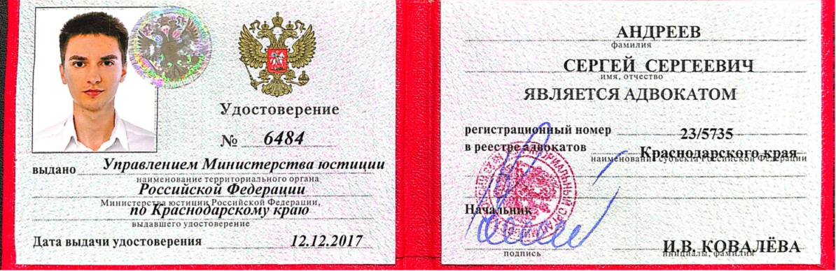 Член Некоммерческой организации "Черноморская коллегия адвокатов" Адвокатской палаты Краснодарского края. Регистрационный номер в реестре адвокатов Краснодарского края 23/6647, удостоверение № 7605 Услуги: Процедура досудебного урегулирования Юридические консультации ✔ Представительство: • гражданское судопроизводство • уголовное судопроизводство • семейные споры, бракоразводные процессы • земельные и жилищные споры • административные дела и правонарушения • споры при ДТП • споры в области трудового и налогового права ✔ Составление правовых документов ✔ Процедура полного списания задолженностей ✔ Юридическое сопровождение предприятий В своей работе уделяю большое внимание репутации, поэтому к проблеме каждого клиента отношусь индивидуально, с учетом всех обстоятельств в каждой отдельно взятой ситуации. "Шаблонный" метод работы полезен не всегда, в связи с этим рассматриваю с каждым клиентом все возможные пути разрешения их проблем.