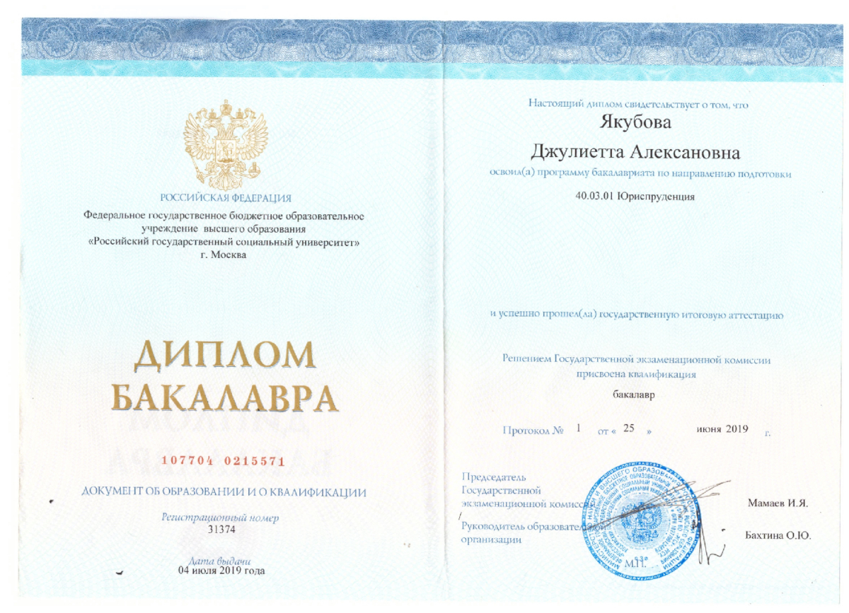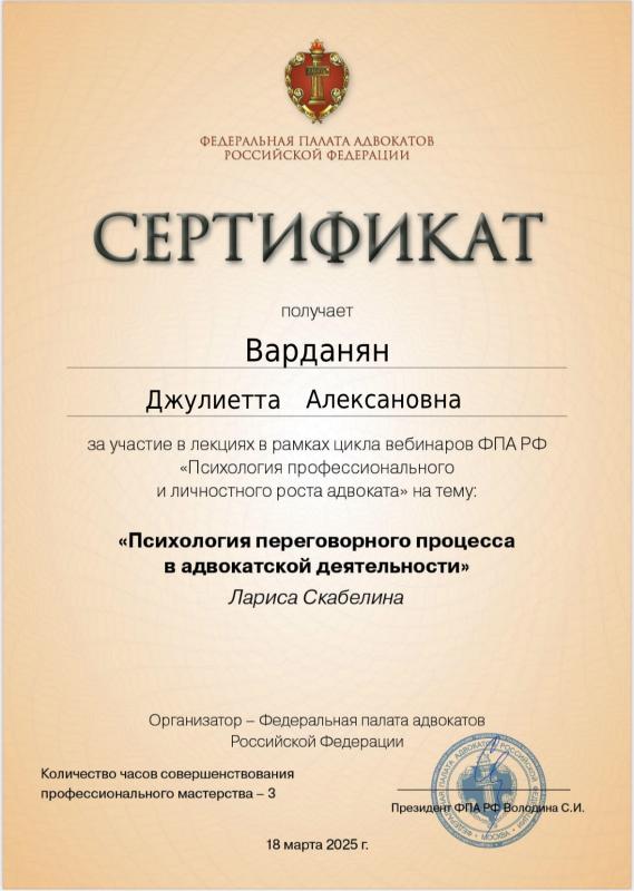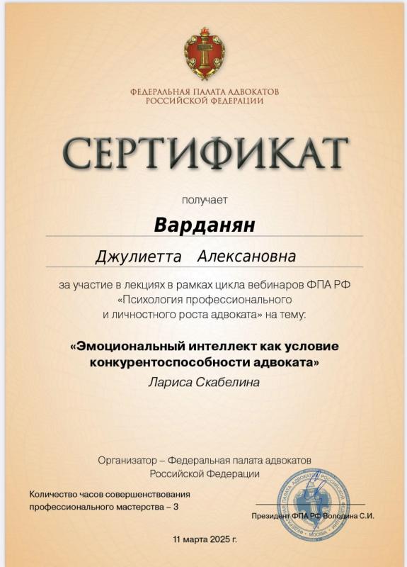 Меня зовут Джулиетта, я адвокат Черноморской коллегии адвокатов, с опытом работы в ФССП России, специализируюсь на решении семейных, гражданских и уголовных дел. Предоставляю квалифицированную помощь в сложных жизненных ситуациях. Мои направления: семейные дела, уголовные дела, гражданские дела. Почему стоит обратиться ко мне? - Чуткий и индивидуальный подход к каждому клиенту. - Конфиденциальность. Умение находить эффективные решения даже в самых сложных делах. Разработка правовой стратегии и реализация всех необходимых действий. Как я работаю: 1. Внимательный анализ вашей ситуации. 2. Разработка стратегии и полное сопровождение до положительного результата. Я регулярно повышаю квалификацию, изучаю изменения в законодательстве и судебной практике, посещаю семинары и курсы, чтобы предлагать клиентам актуальные и эффективные решения. Постоянное развитие и глубокие знания помогают мне успешно решать даже самые сложные правовые вопросы. Помогу Вам найти лучшее решение для вашей проблемы!