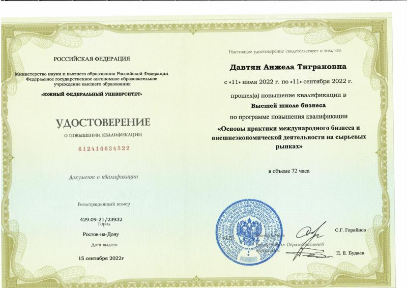 - Пройдена профессиональная подготовка по программе: «Практические основы внешнеторговых операций. Основные базисы международных контрактов и их практическое применение. Логистическое и документарное сопровождение внешнеторговых контрактов в количестве 72 часов».