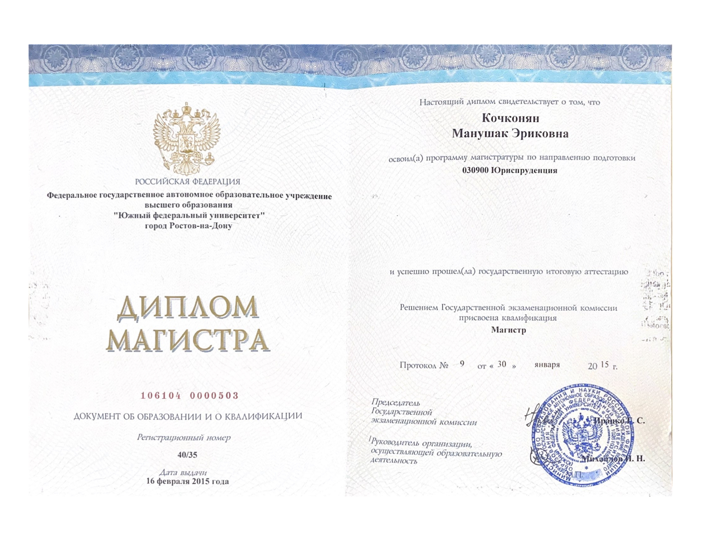 В 2015 году окончила магистратуру юридического факультета Южного Федерального Университета, степень Магистр. Юридический стаж с 2015 года по гражданским, административным и арбитражным делам. Начало карьеры в ЗАО "Стивидорная Компания "Международный Донской Порт" г. Ростов-на-Дону. Имеется также опыт работы на государственной службе. Обширный опыт работы с юридическими лицами на абонентском обслуживании. Предоставлю квалифицированную защиту интересов клиентам. Анализ, разработка, выработка правовой позиции с максимальной эффективностью от 1 до 7 дней в зависимости от сложности дела. Специализируюсь на ряде направлений. Гарантия конфиденциальности, корпоративных сведений и соблюдение всех договоренностей. Стоимость услуг договорная и для каждого случая индивидуальна.