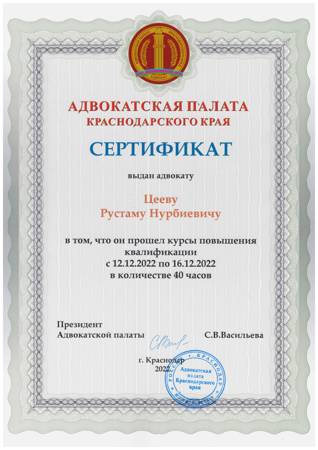 Адвокат Адвокатской палаты Краснодарского края Цеев Рустам Нурбиевич, образование - высшее юридическое, окончил в 2002 году Краснодарский юридический институт МВД РФ, стаж работы в органах внутренних дел 11 лет, в адвокатуре 10 лет, осуществляет свою деятельность выбрав форму адвокатского образования – адвокатский кабинет. Профессиональный адвокат предлагает квалифицированную юридическую помощь по Краснодарскому краю, Республике Адыгея, Ставропольскому краю и др.регионах России.