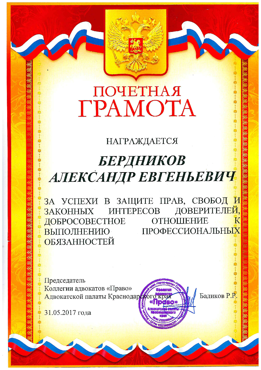 Являюсь председателем коллегии адвокатов "Поляница, Бердников и Партнеры" в Краснодарском крае. Как опытный юрист с многолетней практикой в сферах гражданского и уголовного права, я специализируюсь на защите по уголовным делам экономического характера, представляю интересы в арбитражных судах и судах общей юрисдикции, а также защищаю права на интеллектуальную собственность.