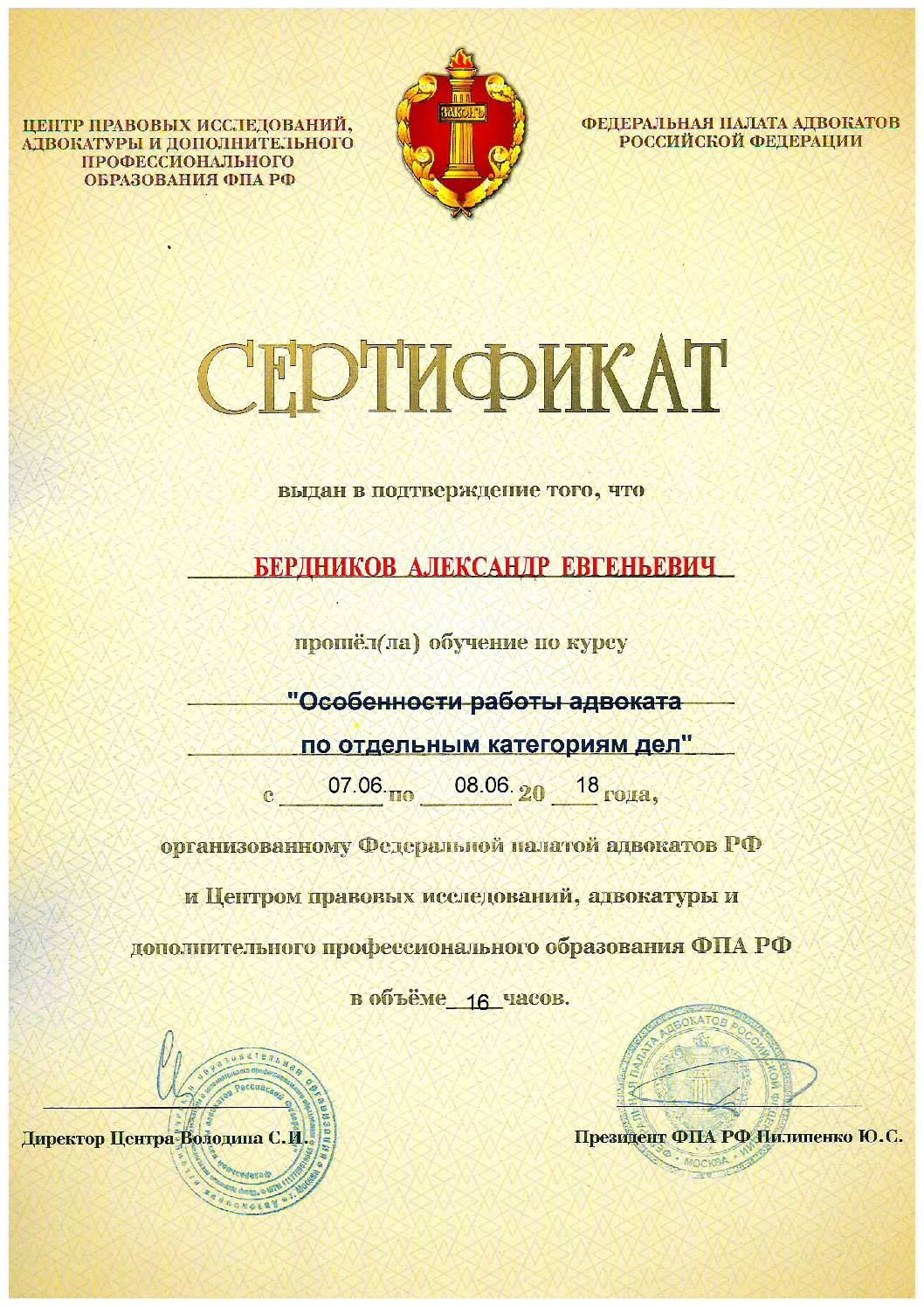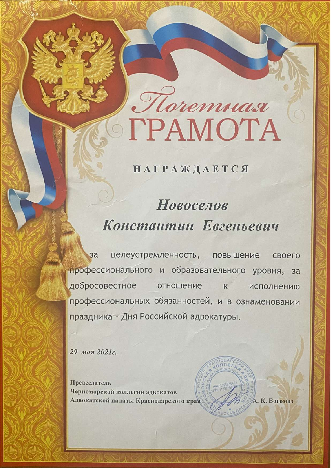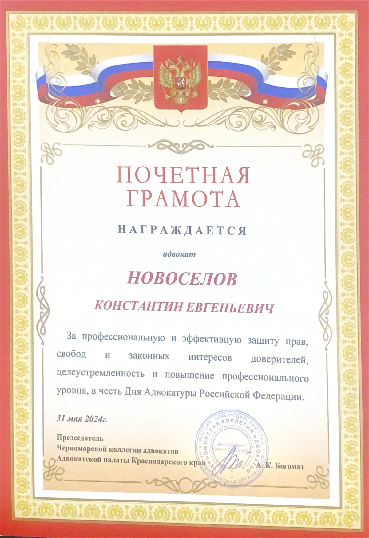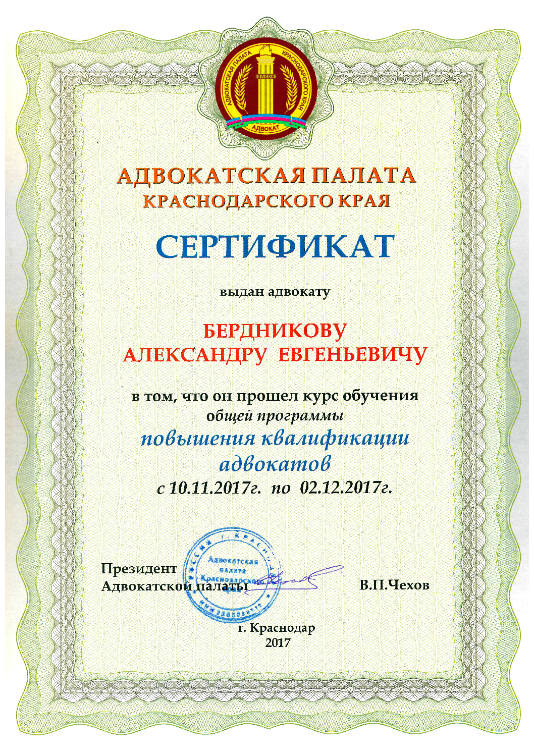 Член Некоммерческой организации "Черноморская коллегия адвокатов" Адвокатской палаты Краснодарского края. Регистрационный номер в реестре адвокатов Краснодарского края 23/6647, удостоверение № 7605 Услуги: Процедура досудебного урегулирования Юридические консультации ✔ Представительство: • гражданское судопроизводство • уголовное судопроизводство • семейные споры, бракоразводные процессы • земельные и жилищные споры • административные дела и правонарушения • споры при ДТП • споры в области трудового и налогового права ✔ Составление правовых документов ✔ Процедура полного списания задолженностей ✔ Юридическое сопровождение предприятий В своей работе уделяю большое внимание репутации, поэтому к проблеме каждого клиента отношусь индивидуально, с учетом всех обстоятельств в каждой отдельно взятой ситуации. "Шаблонный" метод работы полезен не всегда, в связи с этим рассматриваю с каждым клиентом все возможные пути разрешения их проблем.