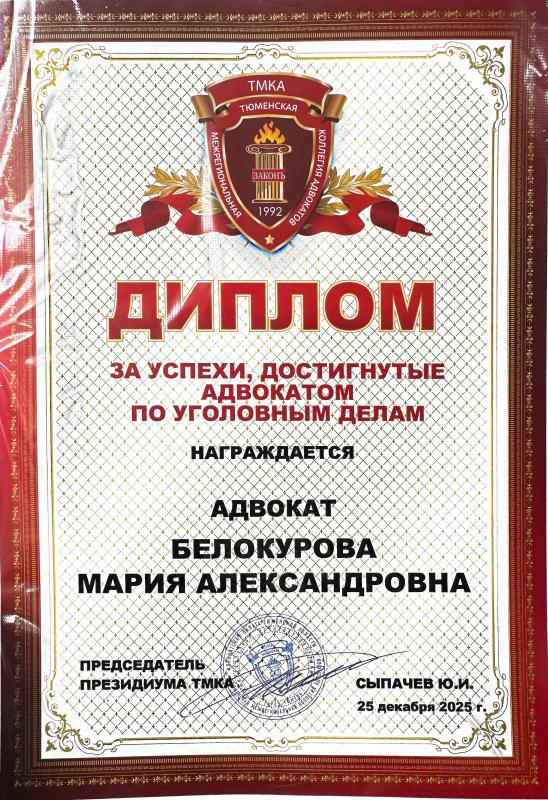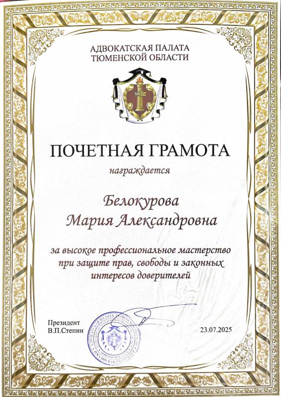 Меня регулярно отмечают благодарственными письмами Адвокатской палаты Тюменской области — это подтверждение профессионализма и ответственного подхода.