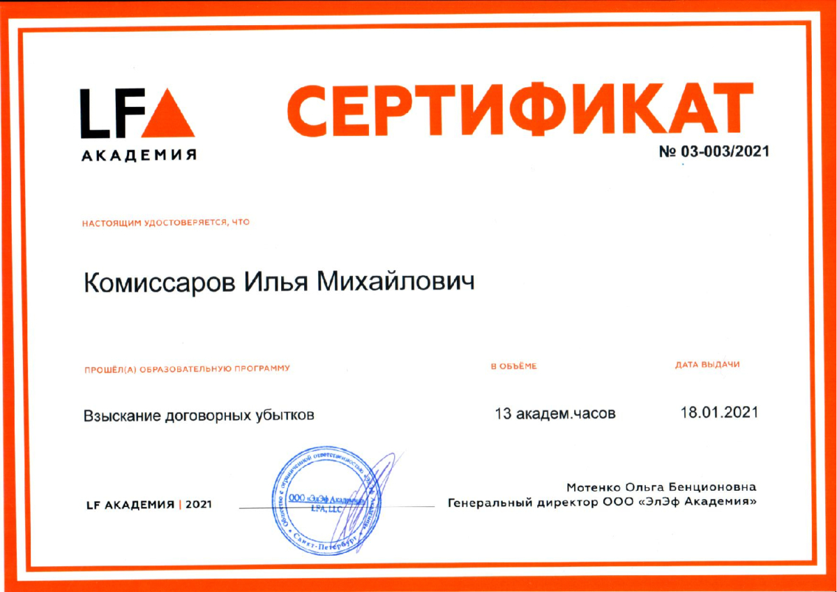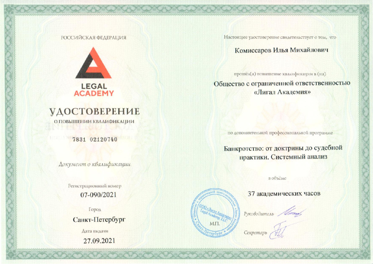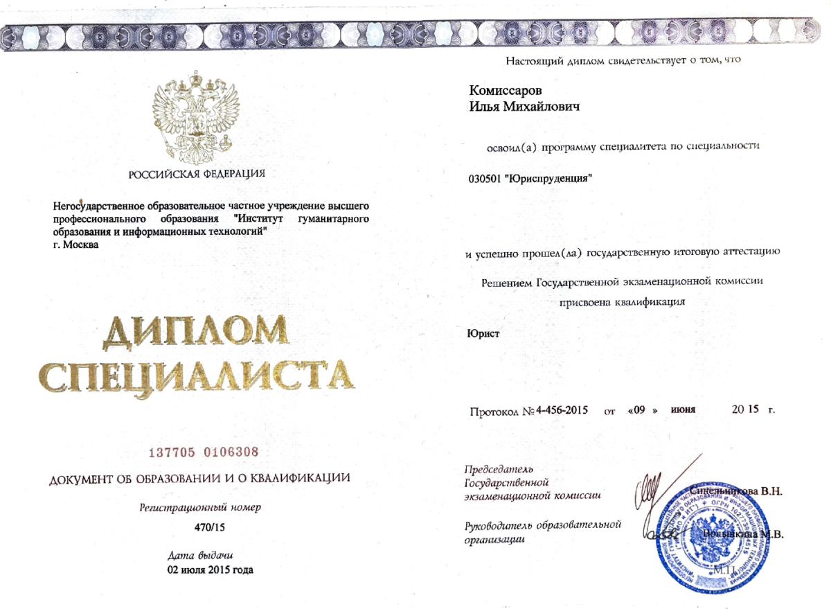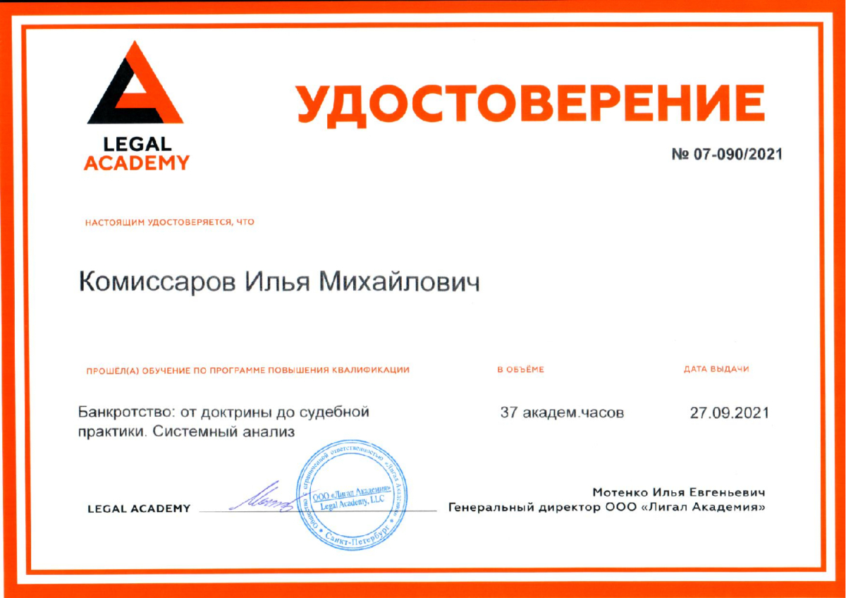 Меня зовут Илья Комиссаров. Я юрист и эксперт в области банкротства граждан и юридических лиц. Высшее образование получил в г. Москва (ИГУМО). За спиной у меня 3 года работы в судебной системе (помощник судьи Арбитражного суда Западно-Сибирского округа), 6 лет работы в крупном холдинге (главный юрист ООО "Строительный Двор"). Являюсь основателем и управляющим партнером Юридической компании "Комиссаров, Виговский и партнеры". Имею отличные навыки и опыт в сфере гражданского права и банкротства, умею понимать и применять нормы права на практике. Обладаю аналитическим складом ума, твердыми убеждениями и логикой, присущей профессионалу, судебным красноречием, грамотной письменной и устной речью. Трудолюбив, внимателен и ответственен, люблю решать сложные правовые задачи и помогать людям. Регулярно повышаю профессиональную квалификацию (в 2017, 2018, 2020, 2021, 2022 гг.), пишу научные статьи (журнале Ex jure. 2019. # 1. «Смысл законодательства как явление современного гражданского права»).
