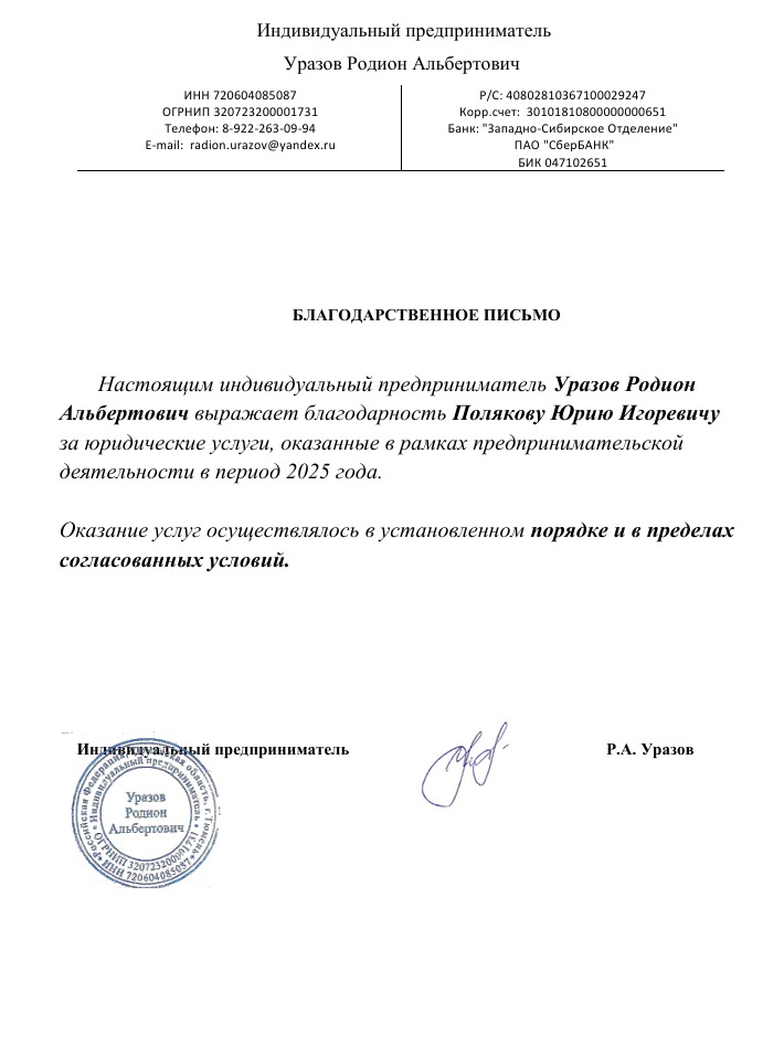Я живу и работаю в Тюмени, оказывая юридические услуги гражданам и организациям с упором на споры о возмещении ущерба, страховые дела, административные штрафы и ЖКХ.
