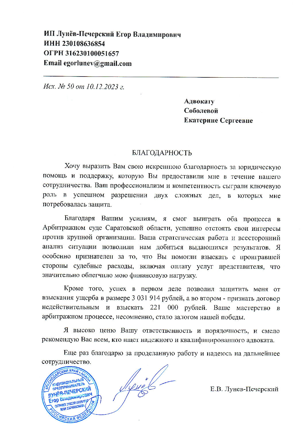 Обладаю практическими знаниями и многолетним успешным опытом работы в различных областях права, включая уголовное, гражданское, семейное, трудовое, административное и налоговое право. Осуществляю представительство в судах общей юрисдикции и в арбитраже. Осуществляю защиту на ЛЮБОЙ стадии уголовного производства. Подготовка и подача кассационной жалобы в Первый кассационный суд общей юрисдикции, в Верховный суд РФ, а также представление интересов на стадии кассационного обжалования. Имею значительный опыт в подготовке и составлении ходатайств о замене наказания более мягким видом, об условно-досрочном освобождении, о досрочном снятии судимости. Имеется успешный многолетний опыт переговоров на досудебной стадии разрешения споров, в том числе, споров, связанных с расторжением брака, разделом совместно нажитого имущества супругов, определением порядка общения с ребенком, определением долей в наследстве. Ведение переговоров в рамках разрешения корпоративных споров.