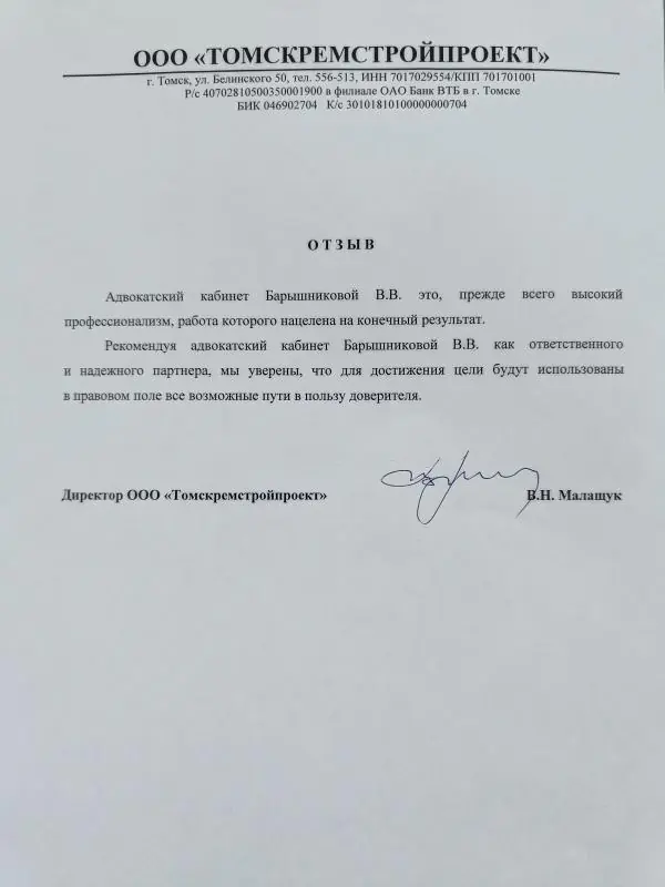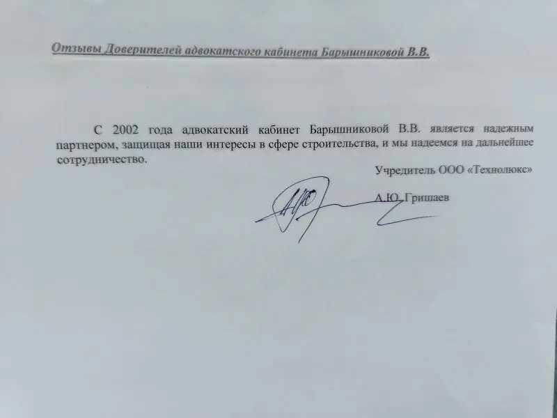 С адвокатом Барышниковой Викторией Владимировной сотрудничаю более года, очень благодарен ей за защиту моих интересов в суде и выигранн... Читать далее