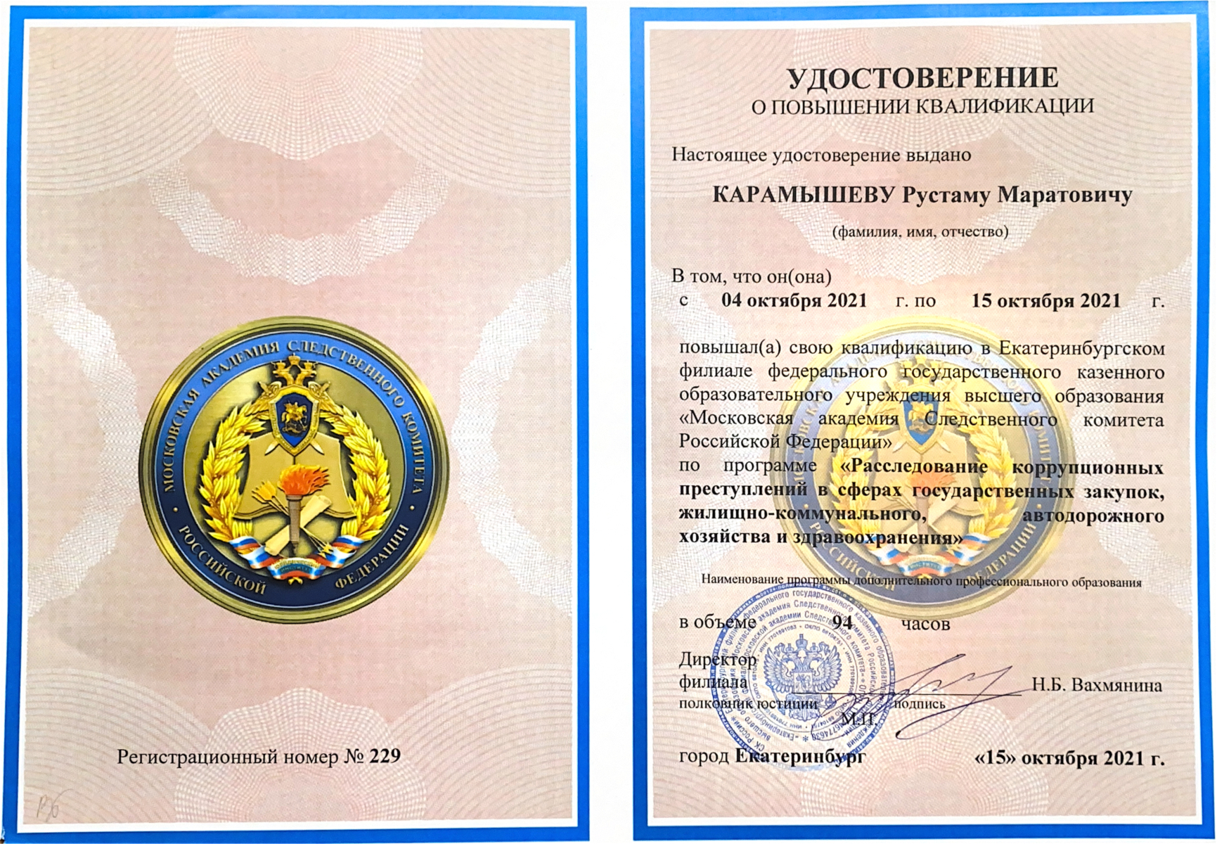 Доброго всем здравия! В 2004 году закончил Челябинский юридический институт МВД РФ по специальности юриспруденция (кафедра криминологии и уголовного права). В 2014 году закончил Южно-Уральский государственный Университет - профессиональная переподготовка по дополнительной профессиональной программе «Оценка стоимости предприятия (бизнеса)». В 2014 году закончил в НОУ ВПО «Санкт-Петербургская юридическая академия» - повышение квалификации по курсу «Недвижимое имущество и сделки с ним с учетом изменений гражданского законодательства». В 2019 году закончил Национальную Ассоциацию Аукционных Брокеров - повышение квалификации по курсу "Аукционный брокер". В 2024 году закончил Академию современных технологий - повышение квалификации по курсу "Землеустройство и кадастр". "Хороший юрист - это не тот, кто всё знает, а тот кто знает где найти ответ".
