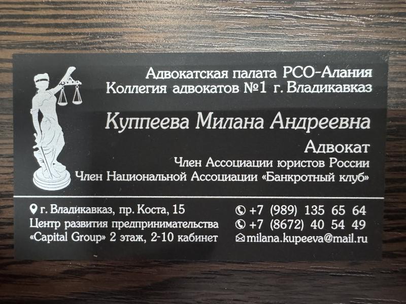 Адвокат с членством в Адвокатской Палате Рсо-Алания и Ассоциации Юристов России предлагает профессиональную юридическую помощь для физических и юридических лиц. Услуги включают: - Ведение гражданских и уголовных дел различной сложности, включая наследственные, жилищные, трудовые, брачно-семейные и земельные споры, а также споры по недвижимости и защите прав потребителей. - Подготовку документов, таких как иски, жалобы, заявления, договоры и правовые заключения. - Участие в переговорах, проведение правового аудита и отправка адвокатских запросов. - Сопровождение сделок с недвижимостью. - Полное сопровождение процедуры банкротства физических лиц. Вы получите гарантированное решение ваших юридических вопросов с профессиональной поддержкой по разумной цене.