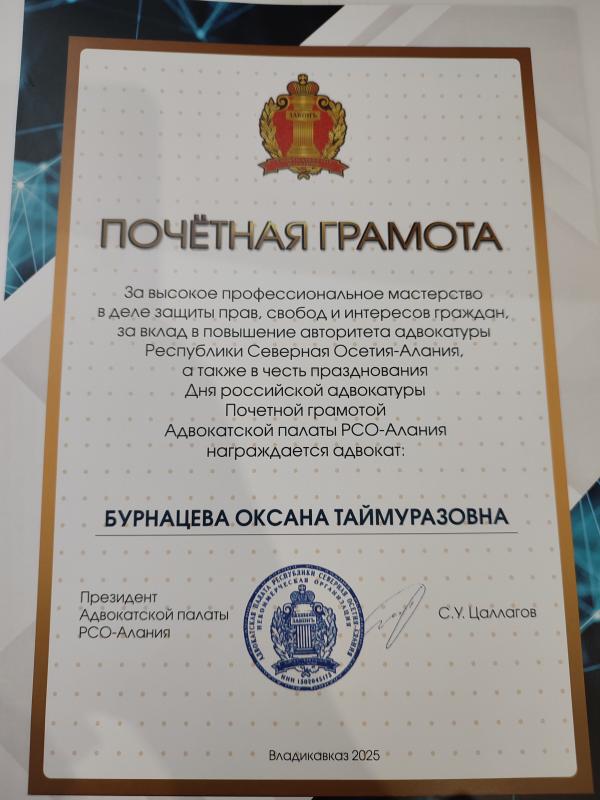 Бурнацева Оксана Таймуразовна - адвокат в Владикавказе, Республика Северная Осетия — Алания, со стажем более 7 лет, указано 17 судебных дел, рейтинг 3.0. Режим работы: будни 9:00-17:00. Email: burnatsevao@mail.ru.