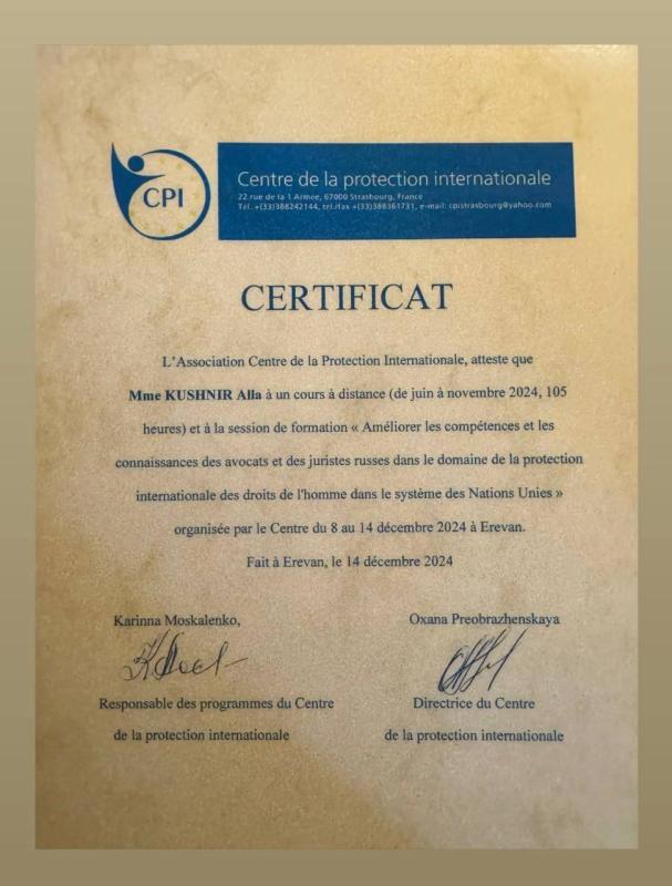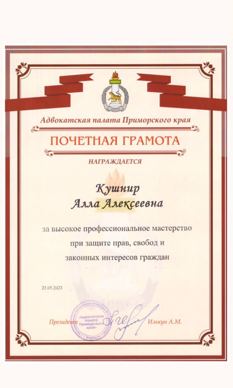 Адвокат Кушнир Алла Алексеевна предоставляет юридические услуги в Приморском крае и, по договоренности, за его пределами. Специализация включает уголовные дела, связанные с экономическими преступлениями, преступлениями против личности, а также против государственной власти и интересов государственной службы. Кроме того, предлагается помощь в разрешении споров, вытекающих из договорных и иных гражданско-правовых отношений.