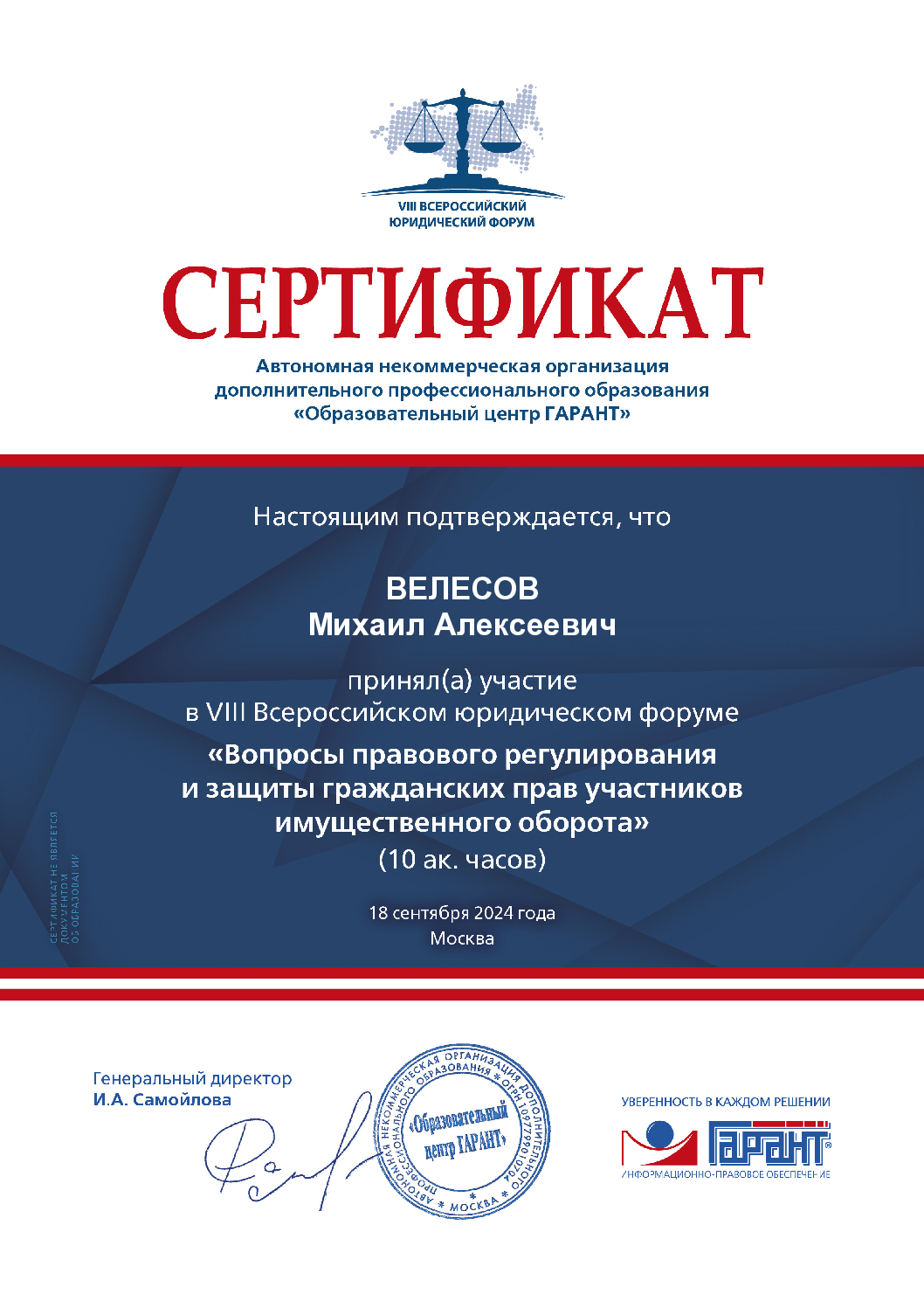 Арбитражный управляющий. Высшее образование, Юрист по специальности «Юриспруденция» Волгоград федеральное государственное автономное образовательное учреждение высшего профессионального образования «Волгоградский государственный университет» 2013г. ОЧУВО «Международный юридический институт» Федеральная служба государственной регистрации, кадастра и картографии (Росреестр) – Свидетельство о сдаче теоретического экзамена по единой программе подготовке арбитражных управляющих 2022г. Стаж - специалист по юридическому сопровождению клиентов – более 10 лет. Экспертно-аналитические функции в области финансов/юриспруденции. Знание законодательства РФ в сфере взыскания, гражданско-правовой специализации.