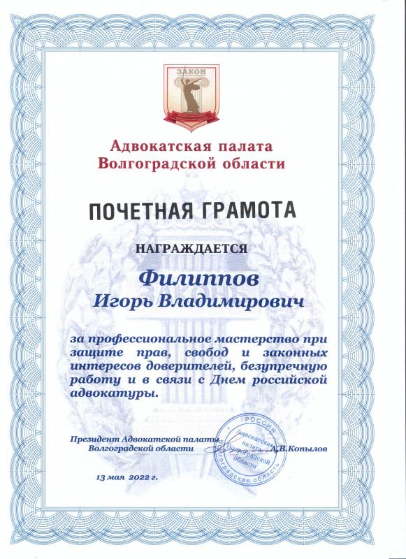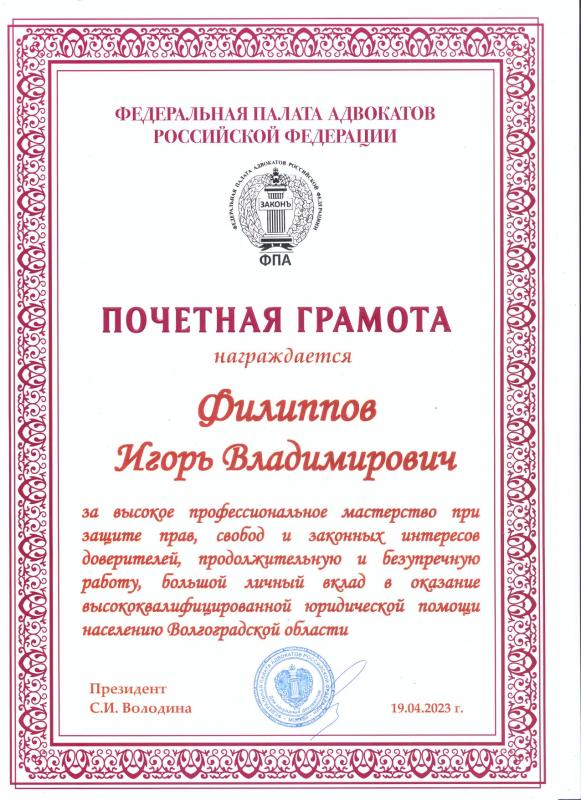 Адвокат Игорь Владимирович Филиппов предоставляет разнообразные юридические услуги. Специализируюсь на защите по уголовным делам как на этапе предварительного расследования, так и в суде. Также представляю интересы физических и юридических лиц в судах общей юрисдикции и арбитражных судах в России. Среди услуг — составление апелляционных и кассационных жалоб по уголовным, гражданским и административным делам. Предлагаю консультации по правовым вопросам как лично, так и удаленно, гарантируя полную конфиденциальность. Помимо этого, занимаюсь вопросами, связанными с исполнением приговора, такими как условно-досрочное освобождение, замена неотбытого наказания на более мягкое и освобождение по состоянию здоровья.