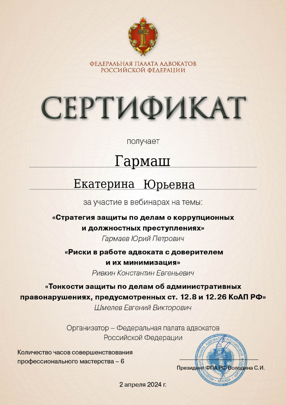Список судебных дел в карточке адвоката может быть не полным и зависит от того, указан ли адвокат Гармаш Екатерина Юрьевна в деле или нет