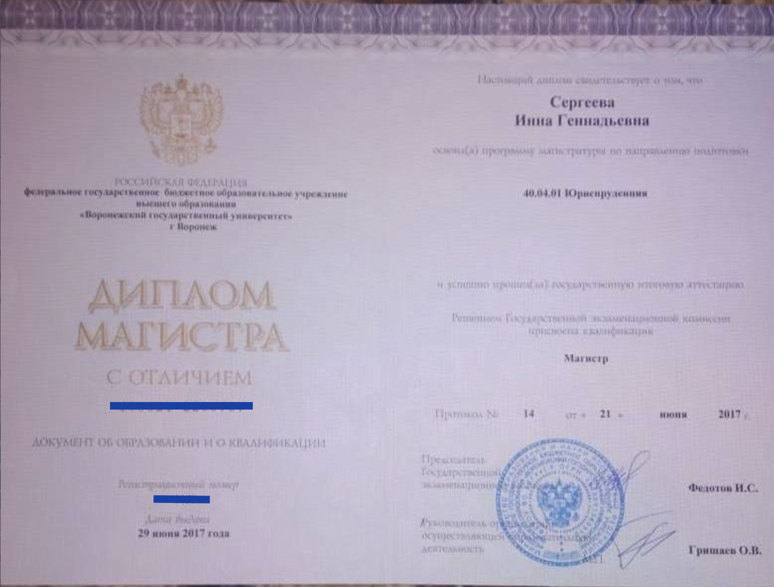 Окончила Воронежский государственный университет юридический факультет в 2016 г. Являюсь магистром трудового, социального и земельного права. Стаж юридической практики свыше 9 лет. Имею большой опыт в разрешении трудовых споров, в том числе по вопросам восстановления на работе; взысканиия заработной платы; обжалования дисциплинарных взысканий.