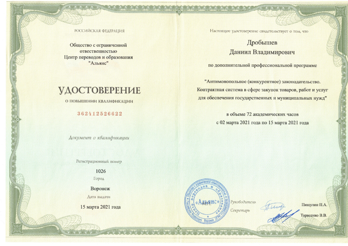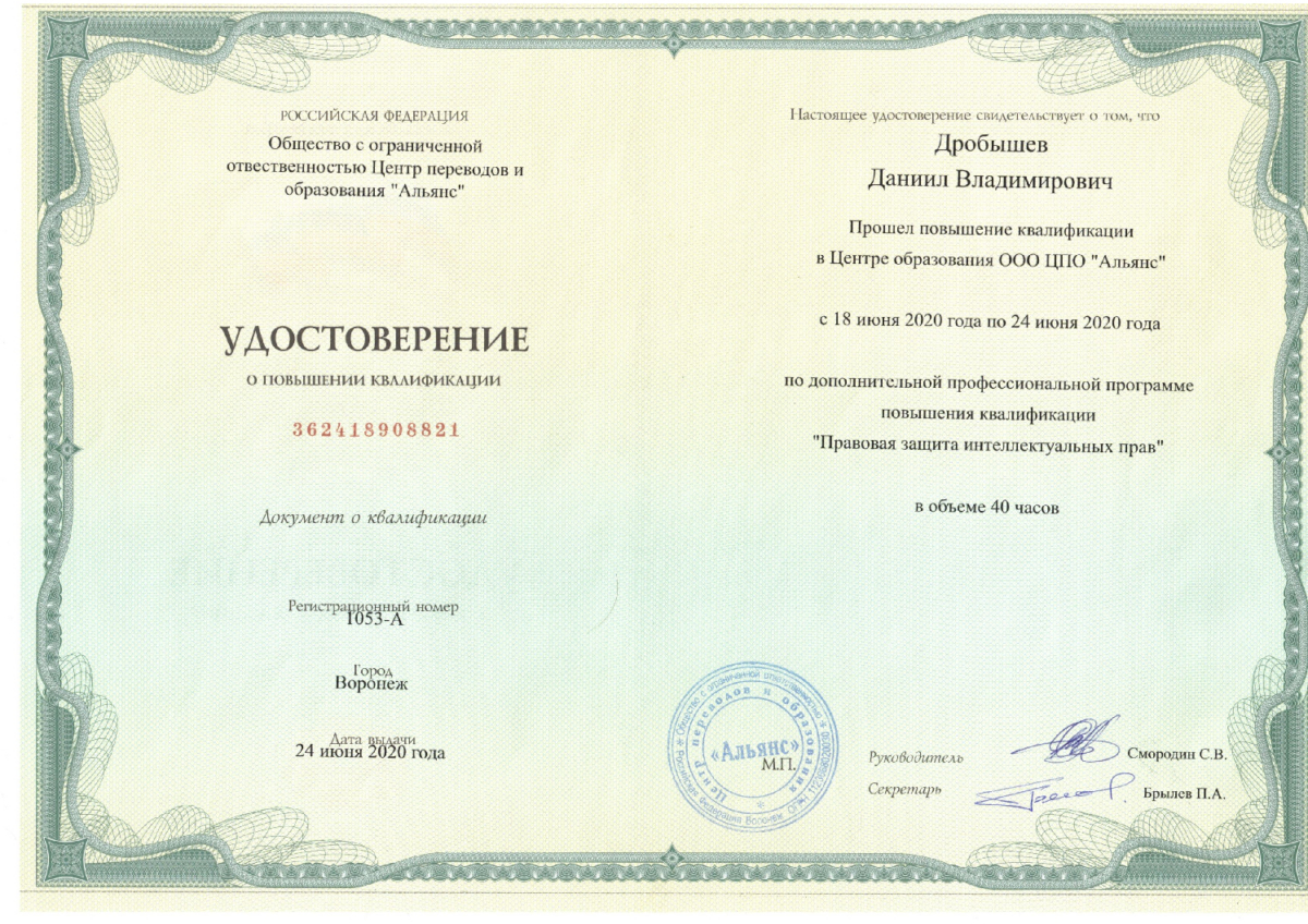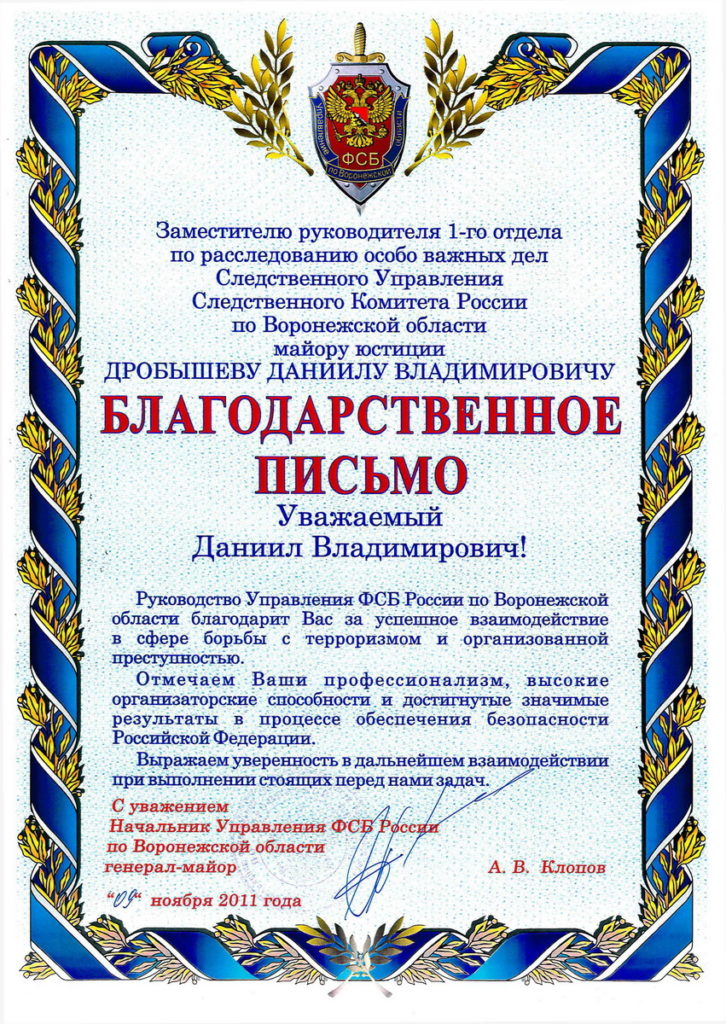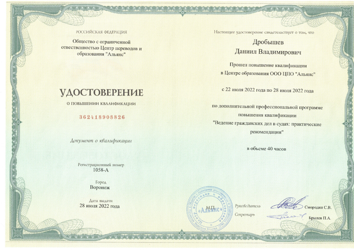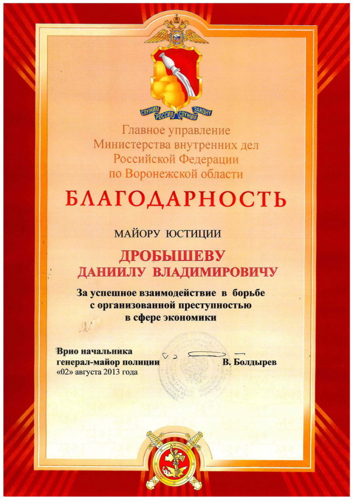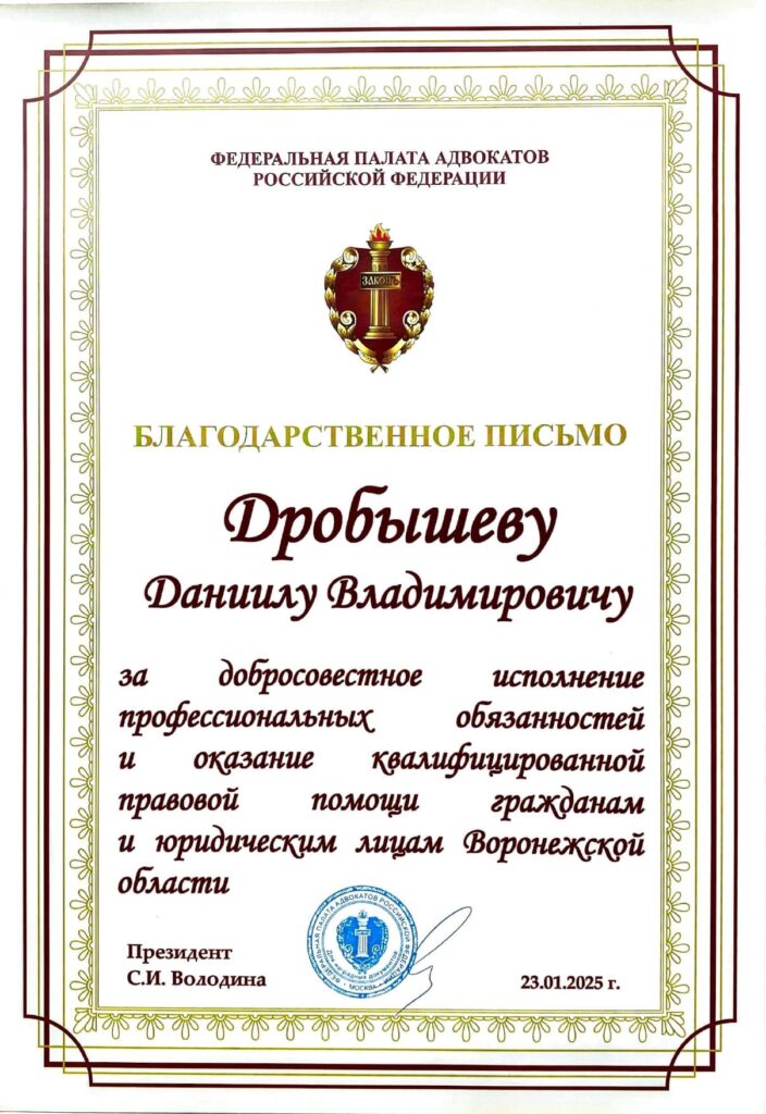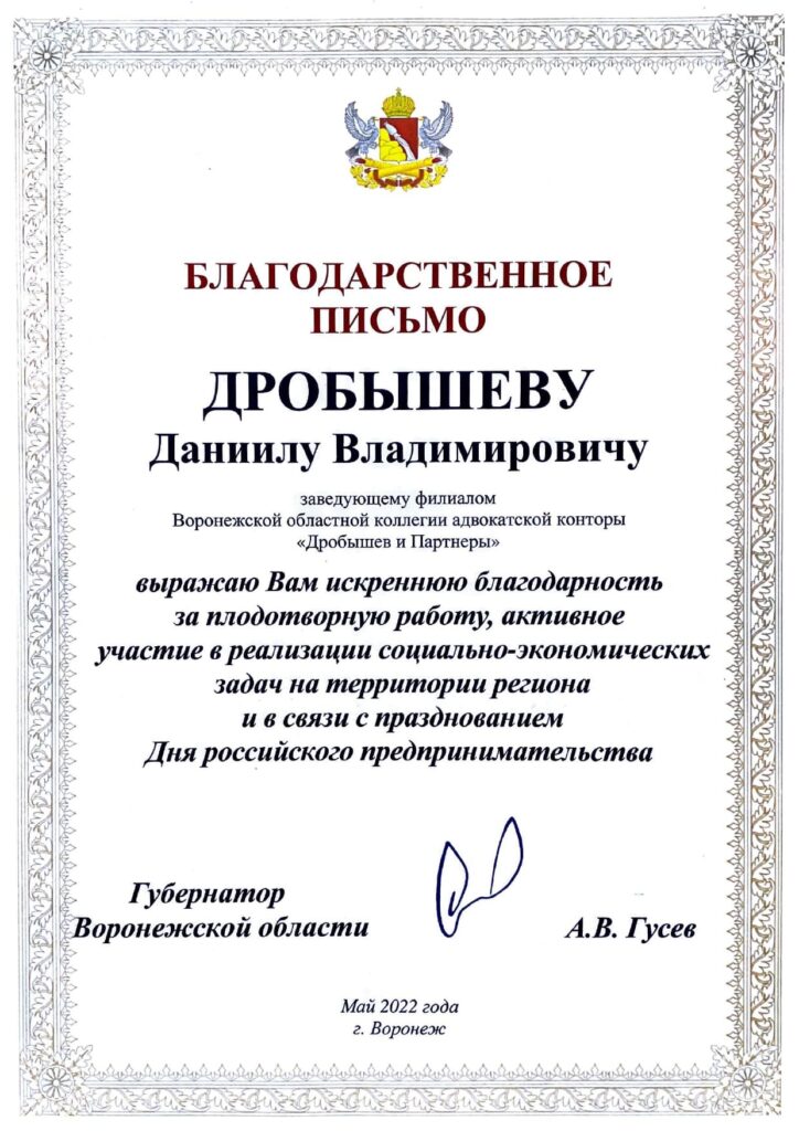 Выражаю огромную признанательность Дробышеву Д.В за ответственный подход и высокое качество предоставленных услуг. Лучший адвокат Ворон... Читать далее