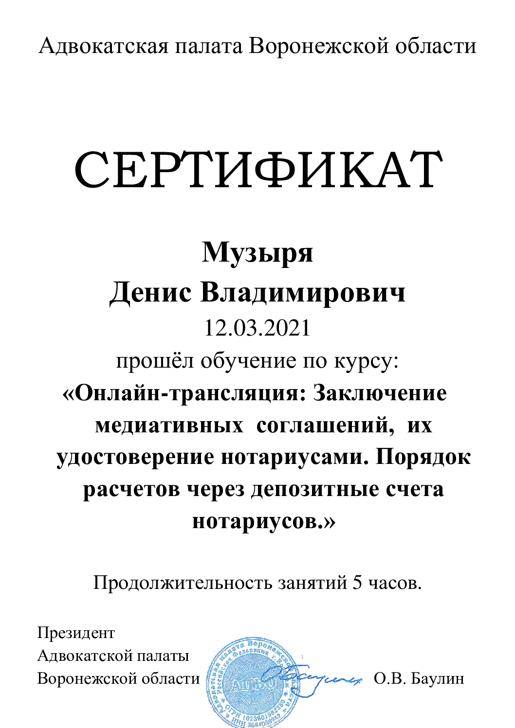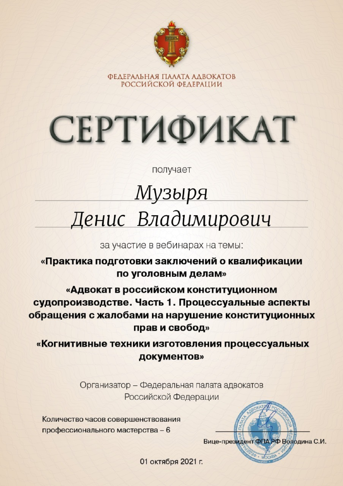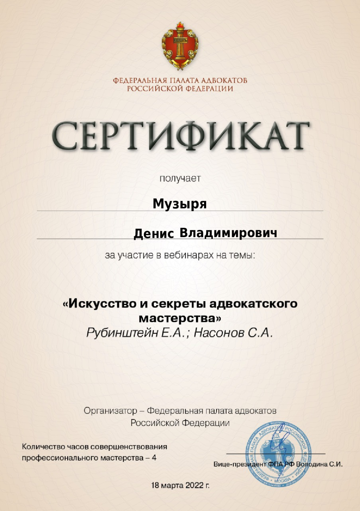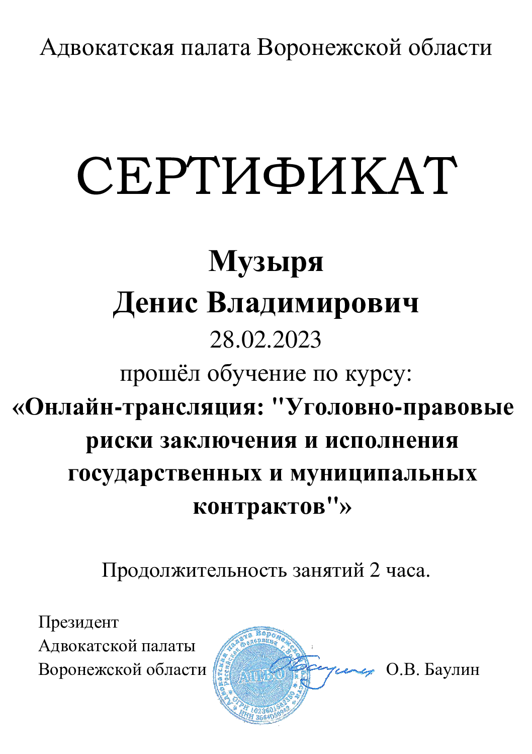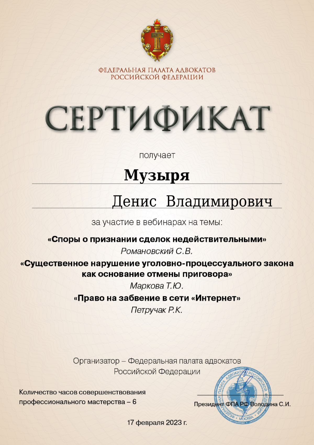 Документы не провереныСписок судебных дел в карточке адвоката может быть не полным и зависит от того, указан ли адвокат Музыря Денис Владимирович в деле или нет