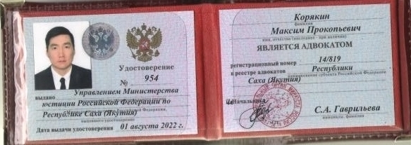 Адвокат Якутской республиканской коллегии адвокатов “Советник” Корякин Максим Прокопьевич, общий юридический стаж свыше 10 лет.