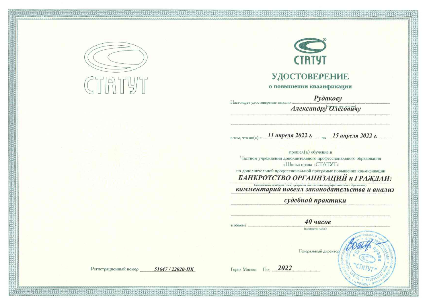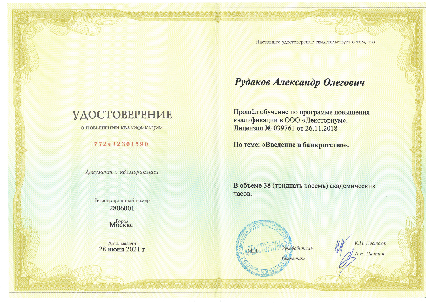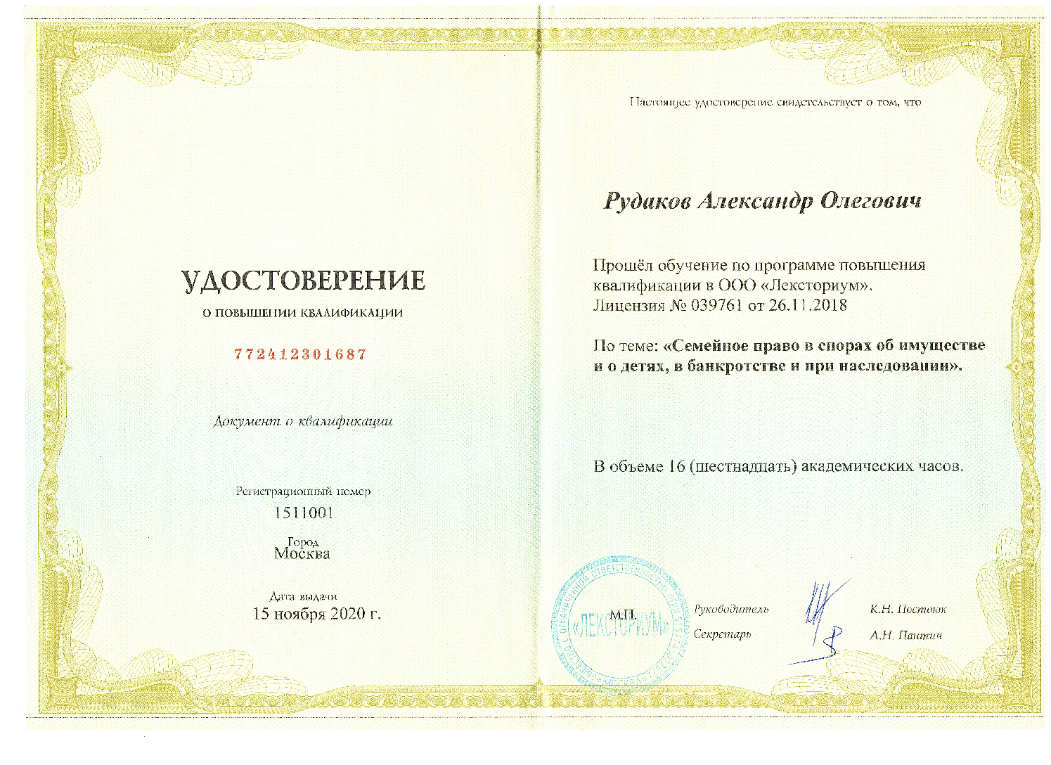Аттестованный Палатой налоговых консультантов России консультант по налогам и сборам (квалификационный аттестат № 19717).