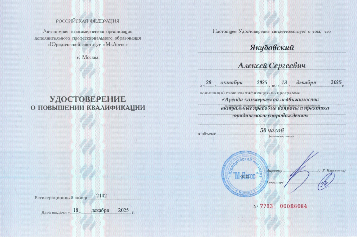 Специалист в области гражданского права с акцентом на коммерческие споры, сделки с недвижимостью и оценку рисков при заключении договоров любой формы и сложности. Также занимаюсь семейными спорами, разделом имущества, жилищными спорами, вопросами наследства и пр. Осуществляю представительство в судах гражданской коллегии любой инстанции и на любой стадии рассмотрения дела.